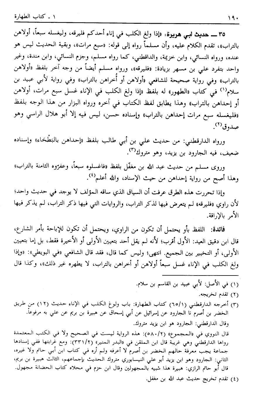 35 - حَدِيث أَبِي هُرَيْرَةَ: "إذَا وَلَغَ الْكَلْبُ فِي إنَاءِ أَحَدِكُمْ فَلْيُرِقْهُ وَلْيَغْسِلْهُ سَبْعًا أُولَاهُنَّ بِالتُّرَابِ" تَقَدَّمَ الْكَلَامُ عَلَيْهِ وَأَنَّ مُسْلِمًا رَوَاهُ إلَى قَوْلِهِ: "سَبْعَ مَرَّاتٍ" وَبَقِيَّةُ الْحَدِيثِ لَيْسَ هو عنده ورواه النَّسَائِيُّ وَابْنُ خُزَيْمَةَ وَالدَّارَقُطْنِيّ كَمَا رَوَاهُ مُسْلِمٌ وَجَزَمَ النَّسَائِيُّ وَابْنُ مَنْدَهْ وَغَيْرُ وَاحِدٍ بِتَفَرُّدِ عَلِيِّ بْنِ مُسْهِرٍ بِزِيَادَةِ "فَلْيُرِقْهُ" وَرَوَاهُ مُسْلِمٌ أَيْضًا مِنْ وَجْهٍ آخَرَ بِلَفْظِ: "أُولَاهُنَّ بِالتُّرَابِ" وَفِي رِوَايَةٍ صَحِيحَةٍ لِلشَّافِعِيِّ "أُولَاهُنَّ أَوْ أُخْرَاهُنَّ بِالتُّرَابِ" وَفِي رِوَايَةٍ لِأَبِي عُبَيْدِ بْنِ سَلَّامٍ1 فِي كِتَابِ الطَّهُورِ لَهُ بِلَفْظِ: "إذَا وَلَغَ الْكَلْبُ فِي الْإِنَاءِ غُسِلَ سَبْعَ مَرَّاتٍ أُولَاهُنَّ أَوْ إحْدَاهُنَّ بِالتُّرَابِ" وَهَذَا يُطَابِقُ لَفْظَ الْكِتَابِ فِي آخِرِهِ وَرَوَاهُ الْبَزَّارُ مِنْ هَذَا الْوَجْهِ بِلَفْظِ فَلْيَغْسِلْهُ سَبْعَ مَرَّاتٍ إحْدَاهُنَّ بِالتُّرَابِ وَإِسْنَادُهُ حَسَنٌ لَيْسَ فِيهِ إلا أبو هلال الراسي وَهُوَ صَدُوقٌ2.