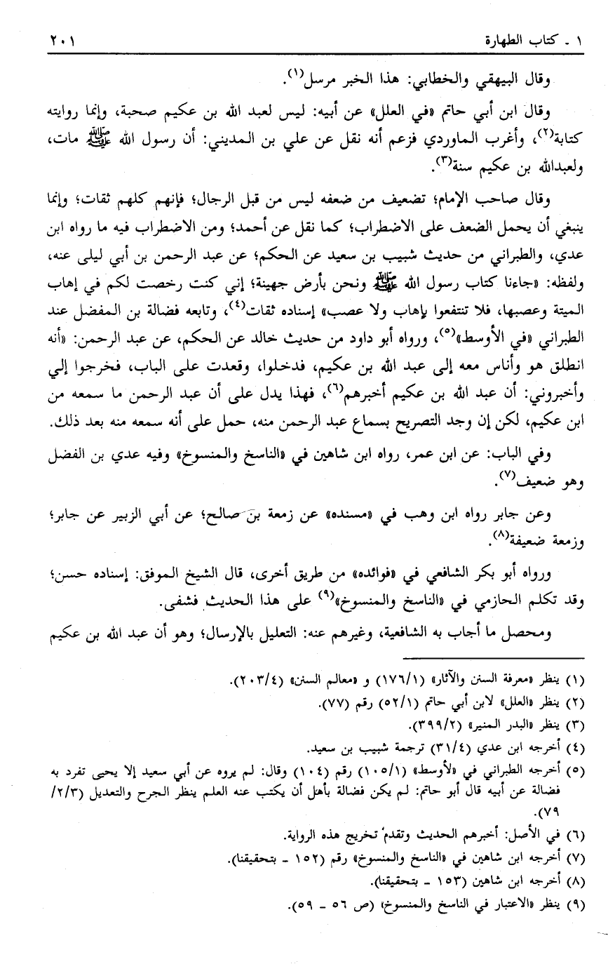وَقَالَ صَاحِبُ الْإِمَامِ تَضْعِيفُ مَنْ ضَعَّفَهُ لَيْسَ مِنْ قِبَلِ الرِّجَالِ فَإِنَّهُمْ كُلُّهُمْ ثِقَاتٌ وَإِنَّمَا يَنْبَغِي أَنْ يُحْمَلَ الضَّعْفُ عَلَى الِاضْطِرَابِ كما نُقِلَ عَنْ أَحْمَدَ وَمِنْ الِاضْطِرَابِ فِيهِ مَا رَوَاهُ ابْنُ عَدِيٍّ وَالطَّبَرَانِيُّ مِنْ حَدِيثِ شُبَيْبِ بْنِ سَعِيدٍ عَنْ الْحَكَمِ عَنْ عَبْدِ الرَّحْمَنِ بْنِ أَبِي لَيْلَى عَنْهُ وَلَفْظُهُ جَاءَنَا كِتَابُ رَسُولِ اللَّهِ صَلَّى اللَّهُ عَلَيْهِ وَسَلَّمَ وَنَحْنُ بِأَرْضِ جُهَيْنَةَ "إنِّي كُنْتُ رَخَّصْتُ لَكُمْ فِي إهَابِ الْمَيْتَةِ وَعَصَبِهَا فَلَا تَنْتَفِعُوا بِإِهَابٍ وَلَا عَصَبٍ" إسْنَادُهُ ثِقَاتٌ4 وَتَابَعَهُ فَضَالَةُ بْنُ الْمُفَضَّلِ عِنْدَ الطَّبَرَانِيِّ فِي الْأَوْسَطِ5 وَرَوَاهُ أَبُو دَاوُد مِنْ حَدِيثِ خَالِدٍ عَنْ الْحَكَمِ عَنْ عَبْدِ الرَّحْمَنِ أَنَّهُ انْطَلَقَ هُوَ وَأُنَاسٌ مَعَهُ إلَى عَبْدِ اللَّهِ بْنِ عُكَيْمٍ فَدَخَلُوا وَقَعَدْتُ عَلَى الْبَابِ فَخَرَجُوا إلَيَّ وَأَخْبَرُونِي أَنَّ عَبْدَ اللَّهِ بْنَ عُكَيْمٍ أَخْبَرَهُمْ6 فَهَذَا يَدُلُّ عَلَى أَنَّ عَبْدَ الرَّحْمَنِ مَا سَمِعَهُ مِنْ ابْن عُكَيْمِ لَكِنْ إنْ وُجِدَ التَّصْرِيحُ بِسَمَاعِ عَبْدِ الرَّحْمَن مِنْهُ حُمِلَ عَلَى أَنَّهُ سَمِعَهُ مِنْهُ بَعْدَ ذَلِكَ.