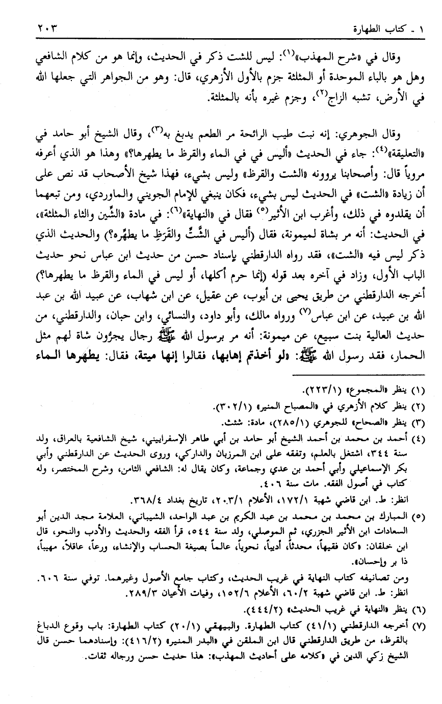 وَقَالَ الْجَوْهَرِيُّ: إنَّهُ نَبْتٌ طَيِّبُ الرَّائِحَةِ مُرُّ الطَّعْمِ يُدْبَغُ بِهِ3 وَقَالَ الشَّيْخُ أَبُو حَامِدٍ فِي التَّعْلِيقَةِ4 جَاءَ فِي الْحَدِيثِ "أَلَيْسَ فِي الْمَاءِ وَالْقَرَظِ مَا يُطَهِّرُهَا؟ " وَهَذَا هُوَ الَّذِي أَعْرِفُهُ مَرْوِيًّا قَالَ وَأَصْحَابُنَا يَرْوُونَهُ: "الشَّتُّ وَالْقَرَظُ" وَلَيْسَ بِشَيْءٍ فَهَذَا شَيْخُ الْأَصْحَابِ قَدْ نَصَّ عَلَى أَنَّ زِيَادَةَ الشَّتِّ فِي الْحَدِيثِ لَيْسَتْ بِشَيْءٍ فَكَانَ يَنْبَغِي لِلْإِمَامِ الْجُوَيْنِيِّ وَالْمَاوَرْدِيِّ وَمَنْ تَبِعَهُمَا أَنْ يُقَلِّدُوهُ فِي ذَلِكَ وَأَغْرَبَ ابْنُ الْأَثِيرِ5 فَقَالَ فِي النِّهَايَةِ6 فِي مَادَّةِ الشِّينِ وَالثَّاءِ الْمُثَلَّثَةِ فِي الْحَدِيثِ أَنَّهُ مَرَّ بِشَاةٍ لِمَيْمُونَةَ فَقَالَ: "أَلَيْسَ فِي الشَّتِّ وَالْقَرَظِ مَا يطهره؟ " والحديث الذي ذكر لَيْسَ فِيهِ الشَّتُّ فَقَدْ رَوَاهُ الدَّارَقُطْنِيُّ بِإِسْنَادٍ حَسَنٍ مِنْ حَدِيثِ ابْنِ عَبَّاسٍ نَحْوَ حَدِيثِ الْبَابِ الْأَوَّلِ وَزَادَ فِي آخِرِهِ بَعْدَ قَوْلِهِ: "إنَّمَا حَرُمَ أَكْلُهَا أو ليس فِي الْمَاءِ وَالْقَرَظِ مَا يُطَهِّرُهَا؟ " أَخْرَجَهُ الدَّارَقُطْنِيُّ مِنْ طَرِيقِ يَحْيَى بْنِ أَيُّوبَ عَنْ عُقَيْلٍ عَنْ ابْنِ شِهَابٍ عَنْ عُبَيْدِ اللَّهِ بْنِ عَبْدِ اللَّهِ بْنِ عُبَيْدٍ عَنْ ابْنِ عَبَّاسٍ7 وَرَوَاهُ مَالِكٌ وَأَبُو دَاوُد وَالنَّسَائِيُّ وَابْنُ حِبَّانَ وَالدَّارَقُطْنِيّ مِنْ حَدِيثِ الْعَالِيَةِ بِنْتِ سُبَيْعٍ عَنْ مَيْمُونَةَ أَنَّهُ مَرَّ بِرَسُولِ اللَّهِ صَلَّى اللَّهُ عَلَيْهِ وَسَلَّمَ رِجَالٌ يَجُرُّونَ شَاةً لَهُمْ مِثْلَ الْحِمَارِ فَقَالَ رَسُولُ اللَّهِ صَلَّى اللَّهُ عَلَيْهِ وَسَلَّمَ: "لَوْ أَخَذْتُمْ إهَابَهَا" فَقَالُوا: إنَّهَا مَيْتَةٌ, فَقَالَ: "يُطَهِّرُهَا الْمَاءُ