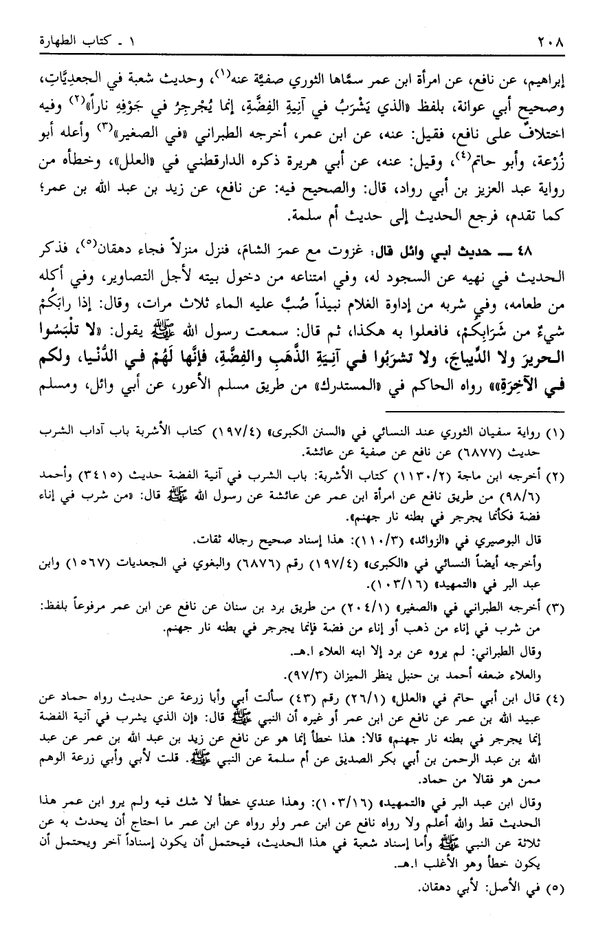 إبْرَاهِيمَ عَنْ نَافِعٍ عَنْ امْرَأَةِ ابْنِ عُمَرَ سَمَّاهَا الثَّوْرِيُّ صَفِيَّةَ عَنْهُ1 وَحَدِيثُ شُعْبَةَ فِي الْجَعْدِيَّاتِ وَصَحِيحِ أَبِي عَوَانَةَ بِلَفْظِ: "الَّذِي يَشْرَبُ فِي آنِيَةِ الْفِضَّةِ إنَّمَا يُجَرْجِرُ فِي جَوْفِهِ نَارًا" 2 وَفِيهِ اخْتِلَافٌ عَلَى نَافِعٍ فَقِيلَ عَنْهُ عَنْ ابْنِ عُمَرَ أَخَرَجَهُ الطَّبَرَانِيُّ فِي الصَّغِيرِ3 وَأَعَلَّهُ أَبُو زُرْعَةَ وَأَبُو حَاتِمٍ4 وَقِيلَ عَنْهُ عَنْ أَبِي هُرَيْرَةَ ذَكَرَهُ الدَّارَقُطْنِيُّ فِي الْعِلَلِ وَخَطَّأَهُ مِنْ رِوَايَةِ عَبْدِ الْعَزِيزِ بْنِ أَبِي رَوَّادٍ قَالَ وَالصَّحِيحُ فِيهِ عَنْ نَافِعٍ عَنْ زَيْدِ بْنِ عَبْدِ اللَّهِ بْنِ عُمَرَ كَمَا تَقَدَّمَ فَرَجَعَ الْحَدِيثُ إلَى حَدِيثِ أُمِّ سَلَمَةَ.