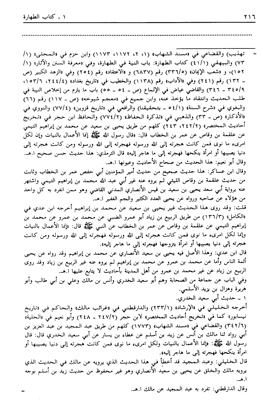 = تهذيب" والقضاعي في "مسند الشهاب" "1، 2، 1172، 1173" وابن حزم في " المحلى" "1/73" والبيهقي "1/41" كتاب الطهارة: باب النية في الطهارة، وفي "معرفة السنن والآثار" "1/152"، و"شعب الإيمان" "5/336" رقم "6837" و"الاعتقاد" رقم "254" وفي "الزهد الكبير" "ص - 132" رقم "241" وفي "الآداب" رقم "1138" والخطيب في "تاريخ بغداد" "4/244، 6/153، 9/345- 346" والقاضي عياض في الإلماع "ص- 54- 55" باب ما يلزم من إخلاص النية في طلب الحديث وانتقاد ما يؤخذ عنه، وابن جميع في "معجم شيوخه" "ص- 117" رقم "66" والبغوي في "شرح السنة" "1/54- بتحقيقنا" والرافعي في "تاريخ قزوين" "4/77" والنووي في "الأذكار" "ص- 33" والذهبي في "تذكرة الحفاظ " "2/774" والحافظ ابن حجر في "تخريج أحاديث المختصر" "2/242، 243" كلهم من طريق يحيى بن سعيد عن محمد بن إبراهيم التيمي عن علقمة بن وقاص عن عمر بن الخطاب قال: قال رسول الله صَلَّى اللَّهُ عَلَيْهِ وَسَلَّمَ: "إنما الأعمال بالنيات إن لكل إمرئ ما نوى فمن كانت هجرته إلى الله ورسوله فهجرته إلى الله ورسوله ومن كانت هجرته إلى دنيا يصيبها أو امرأة ينكحها فهجرته إلى ما هاجر إليه"، قال الترمذي: هذا حديث حسن صحيح ا. هـ. وقال أبو نعيم: هذا الحديث من صحاح الأحاديث وعيونها ا. هـ.
