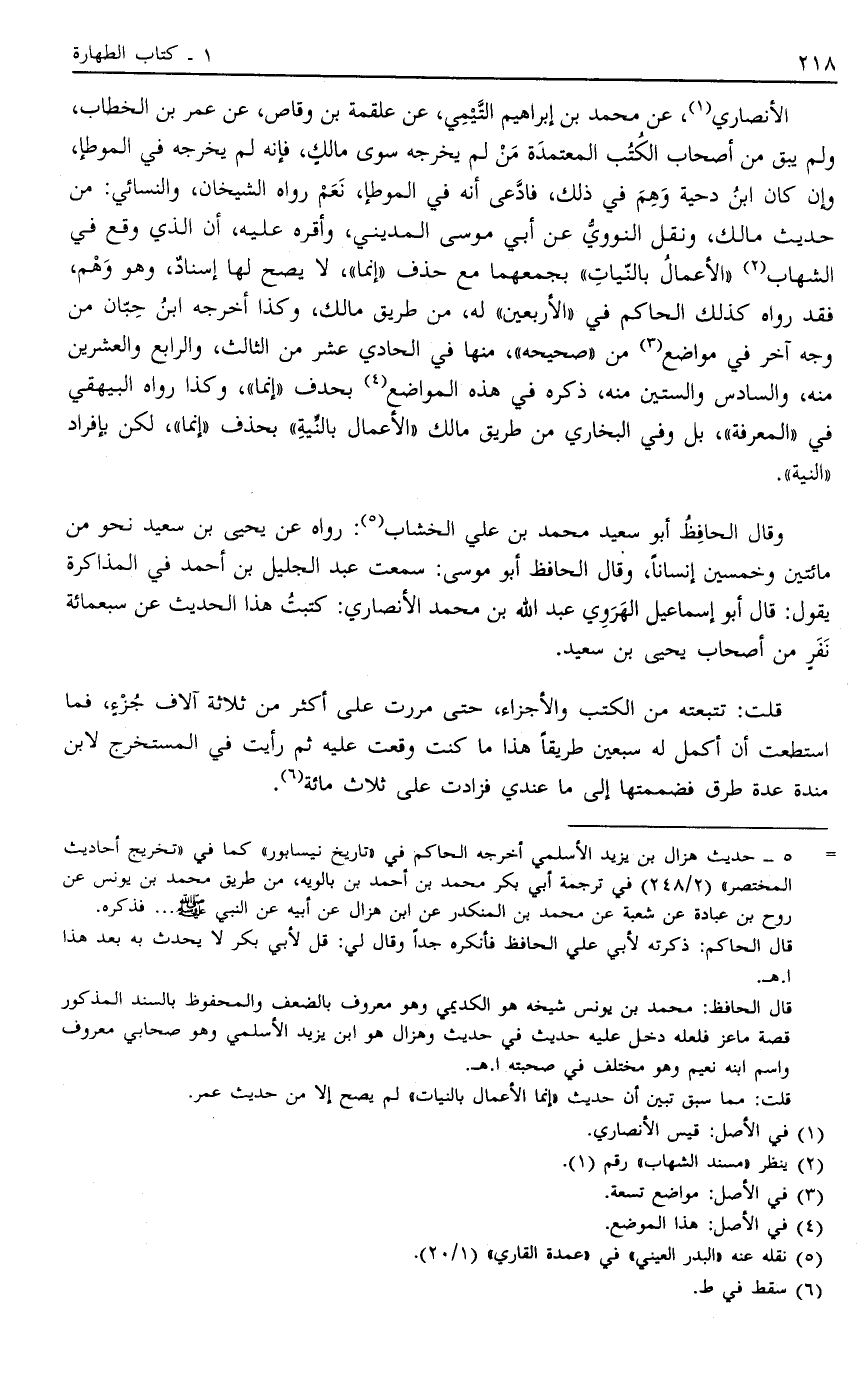 الْأَنْصَارِيِّ1 عَنْ مُحَمَّدِ بْنِ إبْرَاهِيمَ التَّيْمِيِّ عَنْ عَلْقَمَةَ بْنِ وَقَّاصٍ عَنْ عُمَرَ بْنِ الْخَطَّابِ وَلَمْ يَبْقَ مِنْ أَصْحَابِ الْكُتُبِ الْمُعْتَمَدَةِ مَنْ لَمْ يُخْرِجْهُ سِوَى مَالِكٍ فَإِنَّهُ لَمْ يُخْرِجْهُ فِي الْمُوَطَّأِ وَإِنْ كَانَ ابْنُ دِحْيَةَ وَهِمَ فِي ذَلِكَ فَادَّعَى أَنَّهُ فِي الْمُوَطَّأِ نَعَمْ رَوَاهُ الشَّيْخَانِ وَالنَّسَائِيِّ مِنْ حَدِيثِ مَالِكٍ وَنَقَلَ النَّوَوِيُّ عَنْ أَبِي مُوسَى الْمَدِينِيِّ وَأَقَرَّهُ عَلَيْهِ أَنَّ الَّذِي وَقَعَ فِي الشِّهَابِ2 "الْأَعْمَالُ بِالنِّيَّاتِ" بِجَمْعِهِمَا مَعَ حَذْفِ "إنَّمَا" لَا يَصِحُّ لَهَا إسْنَادٌ وَهُوَ وَهْمٌ فَقَدْ رَوَاهُ كَذَلِكَ الْحَاكِمُ فِي الْأَرْبَعِينَ لَهُ مِنْ طَرِيقِ مَالِكٍ وَكَذَا أَخْرَجَهُ ابْنُ حِبَّانَ مِنْ وَجْهٍ آخَرَ فِي مَوَاضِعَ3 مِنْ صَحِيحِهِ مِنْهَا فِي الْحَادِي عَشَرَ مِنْ الثَّالِثِ وَالرَّابِعِ وَالْعِشْرِينَ مِنْهُ وَالسَّادِسِ وَالسِّتِّينَ مِنْهُ ذَكَرَهُ فِي هَذِهِ الْمَوَاضِعِ4 بِحَذْفِ إنَّمَا وَكَذَا رَوَاهُ الْبَيْهَقِيُّ فِي الْمَعْرِفَةِ بَلْ وَفِي الْبُخَارِيِّ مِنْ طَرِيقِ مَالِكٍ "الْأَعْمَالُ بِالنِّيَّةِ" بِحَذْفِ إنَّمَا لَكِنْ بِإِفْرَادِ النِّيَّةِ.