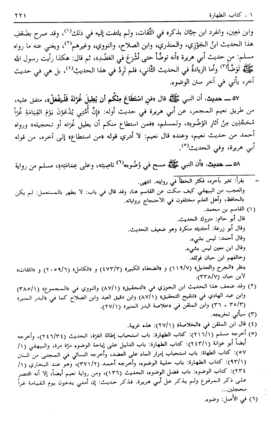 57 - حَدِيثُ أَنَّ النَّبِيَّ صَلَّى اللَّهُ عَلَيْهِ وَسَلَّمَ قَالَ: "مَنْ اسْتَطَاعَ مِنْكُمْ أَنْ يُطِيلَ غُرَّتُهُ فَلْيَفْعَلْ" مُتَّفَقٌ عَلَيْهِ مِنْ طَرِيقِ نُعَيْمٍ الْمُجْمِرِ عَنْ أَبِي هُرَيْرَةَ فِي حَدِيثٍ أَوَّلُهُ "إنَّ أُمَّتِي يُدْعَوْنَ يَوْمَ الْقِيَامَةِ غُرًّا مُحَجَّلِينَ مِنْ آثَارِ الْوُضُوءِ" وَلِمُسْلِمٍ: "فَمَنْ اسْتَطَاعَ مِنْكُمْ أَنْ يُطِيلَ غُرَّتَهُ أَوْ تَحْجِيلَهُ" وَرَوَاهُ أَحْمَدُ مِنْ حَدِيثِ نُعَيْمٍ وَعِنْدَهُ قَالَ نُعَيْمٌ لَا أَدْرِي قَوْلَهُ: "مَنْ اسْتَطَاعَ" إلَى آخره من قوله أَبِي هُرَيْرَةَ أَوْ فِي الْحَدِيثِ5.