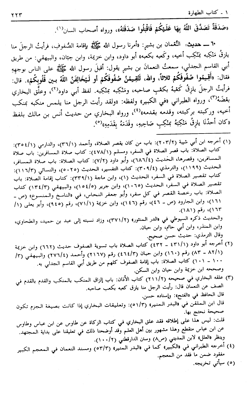 3 علقه البخاري في صحيحه "2/211" كتاب الأذان: باب إلزاق المنكب بالمنكب والقدم بالقدم في الصف عن النعمان قال: رأيت الرجل منا يلزق كعبه بكعب صاحبه.