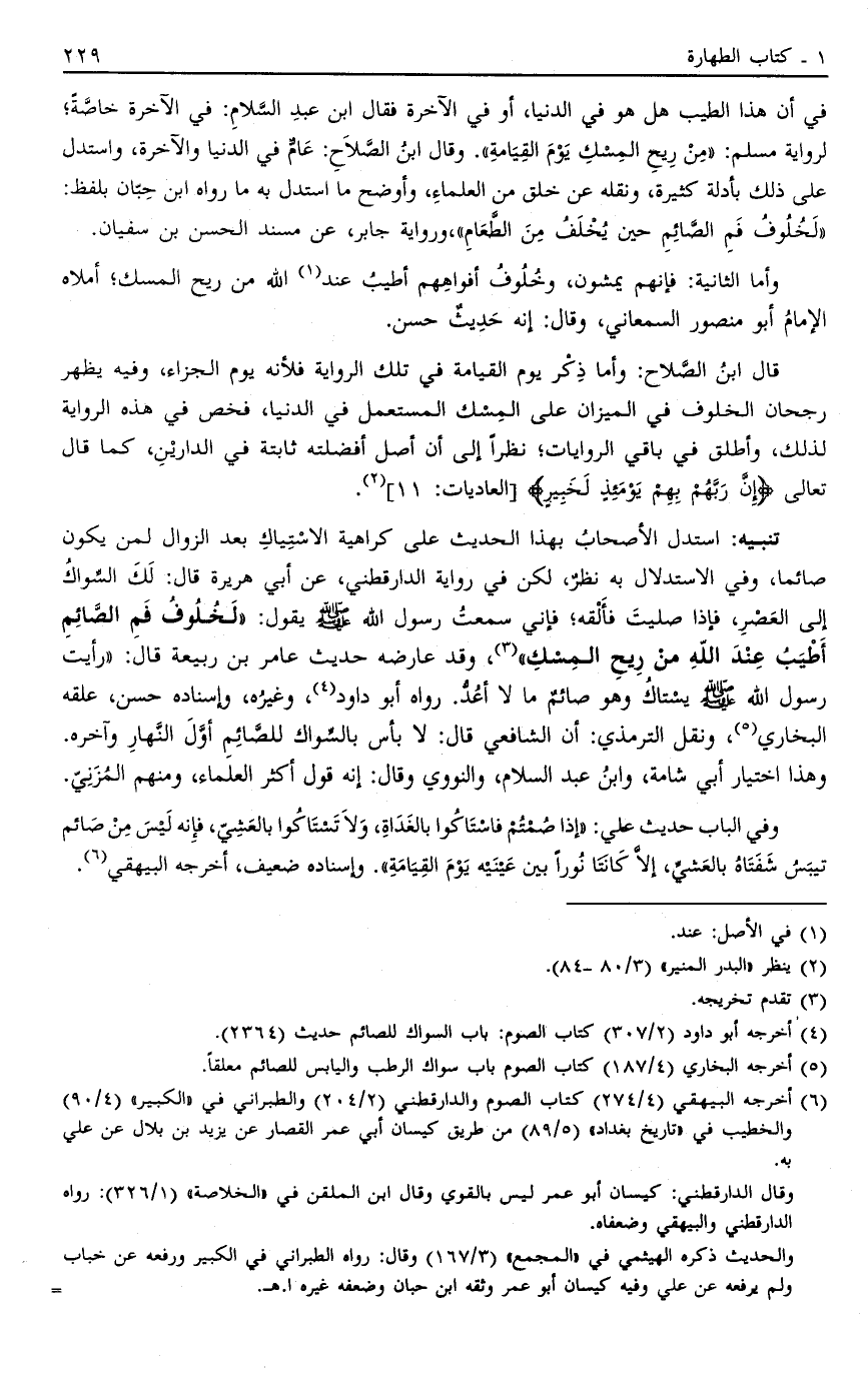 تنبيه: استدل الْأَصْحَابُ بِهَذَا الْحَدِيثِ عَلَى كَرَاهِيَةِ الِاسْتِيَاكِ بَعْدَ الزَّوَالِ لِمَنْ يَكُونُ صَائِمًا وَفِي الِاسْتِدْلَالِ بِهِ نَظَرٌ لَكِنْ فِي رِوَايَةِ الدَّارَقُطْنِيِّ عَنْ أَبِي هُرَيْرَةَ قَالَ لَك السِّوَاكُ إلَى الْعَصْرِ فَإِذَا صَلَّيْت فَأَلْقِهِ فَإِنِّي سَمِعْتُ رَسُولَ اللَّهِ صَلَّى اللَّهُ عَلَيْهِ وَسَلَّمَ يَقُولُ: "لَخُلُوفُ فَمِ الصَّائِمِ أَطْيَبُ عِنْدَ اللَّهِ مِنْ رِيحِ الْمِسْكِ" 3، وَقَدْ عَارَضَهُ حَدِيثُ عَامِرِ بْنِ رَبِيعَةَ قَالَ رَأَيْتُ رَسُولَ اللَّهِ صَلَّى اللَّهُ عَلَيْهِ وَسَلَّمَ يَسْتَاكُ وَهُوَ صَائِمٌ مَا لَا أَعُدُّ, رَوَاهُ أَبُو دَاوُد4 وَغَيْرِهِ وَإِسْنَادُهُ حَسَنٌ عَلَّقَهُ الْبُخَارِيُّ5 وَنَقَلَ التِّرْمِذِيُّ أَنَّ الشَّافِعِيَّ قَالَ: لَا بَأْسَ بِالسِّوَاكِ لِلصَّائِمِ أَوَّلَ النَّهَارِ وَآخِرَهُ وَهَذَا اخْتِيَارُ أَبِي شَامَةَ وَابْنِ عَبْدِ السِّلَامِ وَالنَّوَوِيِّ وَقَالَ: إنَّهُ قَوْلُ أَكْثَرِ الْعُلَمَاءِ وَمِنْهُمْ الْمُزَنِيّ. وَفِي الْبَابِ حَدِيثُ عَلِيٍّ: "إذَا صُمْتُمْ فَاسْتَاكُوا بِالْغَدَاةِ وَلَا تَسْتَاكُوا بِالْعَشِيِّ فَإِنَّهُ لَيْسَ مِنْ صَائِمٍ تَيْبَسُ شَفَتَاهُ بِالْعَشِيِّ إلَّا كَانَتَا نُورًا بَيْن عَيْنَيْهِ يَوْمَ الْقِيَامَةِ" وَإِسْنَادُهُ ضَعِيفٌ أَخَرَجَهُ الْبَيْهَقِيُّ6.