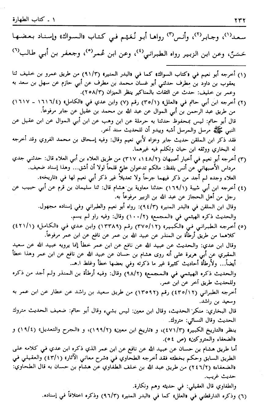 سَعْدٍ1 وَجَابِرٍ2 وَأَنَسٍ3 رَوَاهَا أَبُو نُعَيْمٍ فِي كِتَابِ السِّوَاكِ وَإِسْنَادُ بَعْضِهَا حَسَنٌ وَعَنْ ابْنِ 4 الزُّبَيْرِ رَوَاهُ الطَّبَرَانِيُّ4 وَعَنْ ابْنِ 5 عُمَرَ5 وَجَعْفَرِ بْنِ أَبِي طَالِبٍ6
