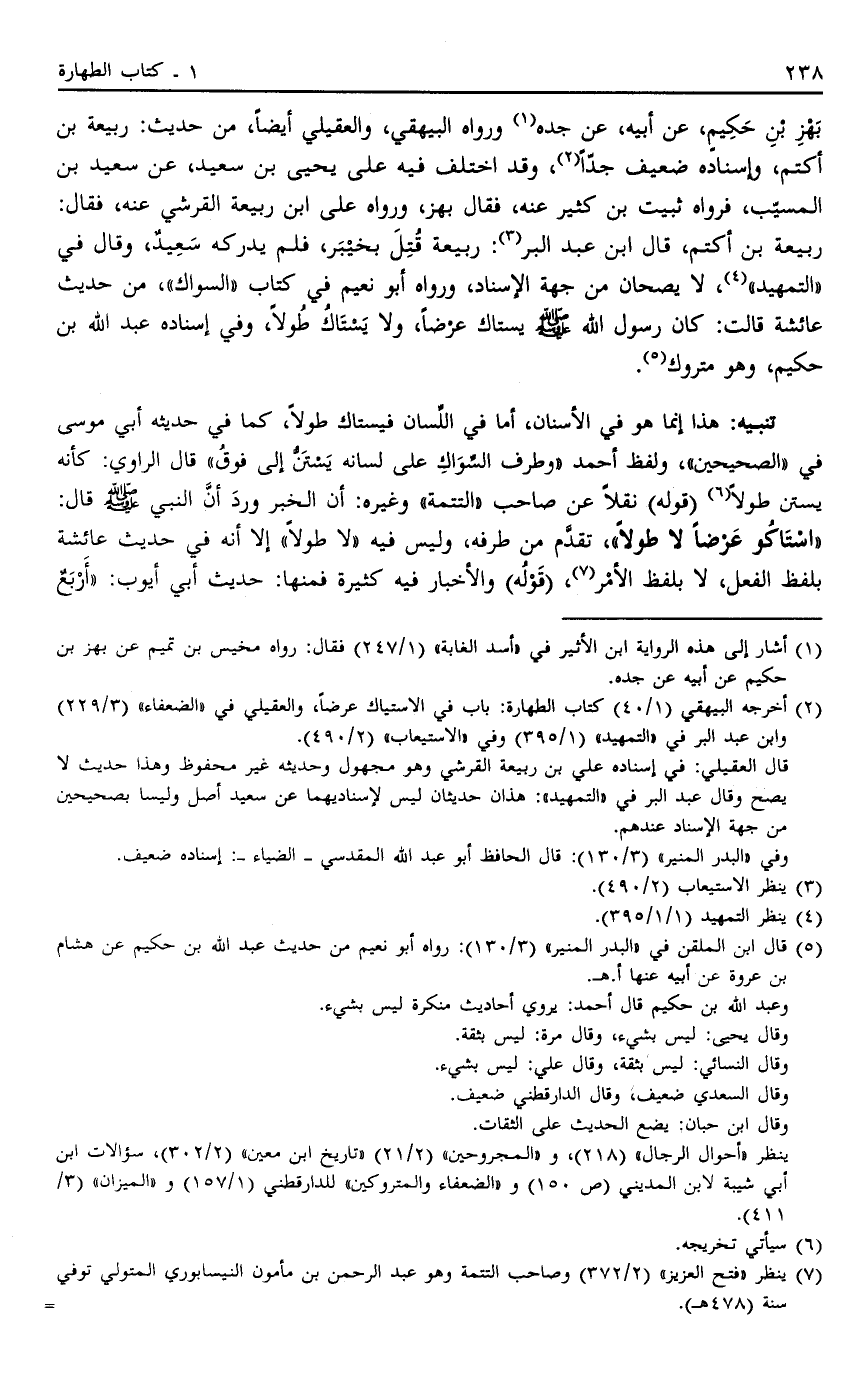 بَهْزِ بْنِ حَكِيمٍ عَنْ أَبِيهِ عَنْ جَدِّهِ1 وَرَوَاهُ الْبَيْهَقِيُّ وَالْعُقَيْلِيُّ أَيْضًا مِنْ حَدِيثِ رَبِيعَةَ بْنِ أكتم وَإِسْنَادُهُ ضَعِيفٌ جِدًّا2 وَقَدْ اُخْتُلِفَ فِيهِ عَلَى يَحْيَى بْنِ سَعِيدٍ عَنْ سَعِيدِ بْنِ الْمُسَيِّبِ فَرَوَاهُ ثَبِيتُ بْنُ كَثِيرٍ عَنْهُ فَقَالَ بَهْزٌ وَرَوَاهُ عَلِيُّ بْنُ رَبِيعَةَ الْقُرَشِيُّ عَنْهُ فَقَالَ ربيعة بن أكتم قَالَ ابْنُ عَبْدِ الْبَرِّ3 رَبِيعَةُ قُتِلَ بِخَيْبَرَ فَلَمْ يُدْرِكْهُ سَعِيدٌ وَقَالَ فِي التَّمْهِيدِ4 لَا يَصِحَّانِ مِنْ جِهَةِ الْإِسْنَادِ وَرَوَاهُ أَبُو نُعَيْمٍ فِي كِتَابِ السِّوَاكِ مِنْ حَدِيثِ عَائِشَةَ قَالَتْ: كان رسول الله صَلَّى اللَّهُ عَلَيْهِ وَسَلَّمَ يَسْتَاكُ عَرْضًا وَلَا يَسْتَاكُ طُولًا وَفِي إسْنَادِهِ عَبْدِ اللَّهِ بْنِ حَكِيمٍ وَهُوَ مَتْرُوكٌ5.