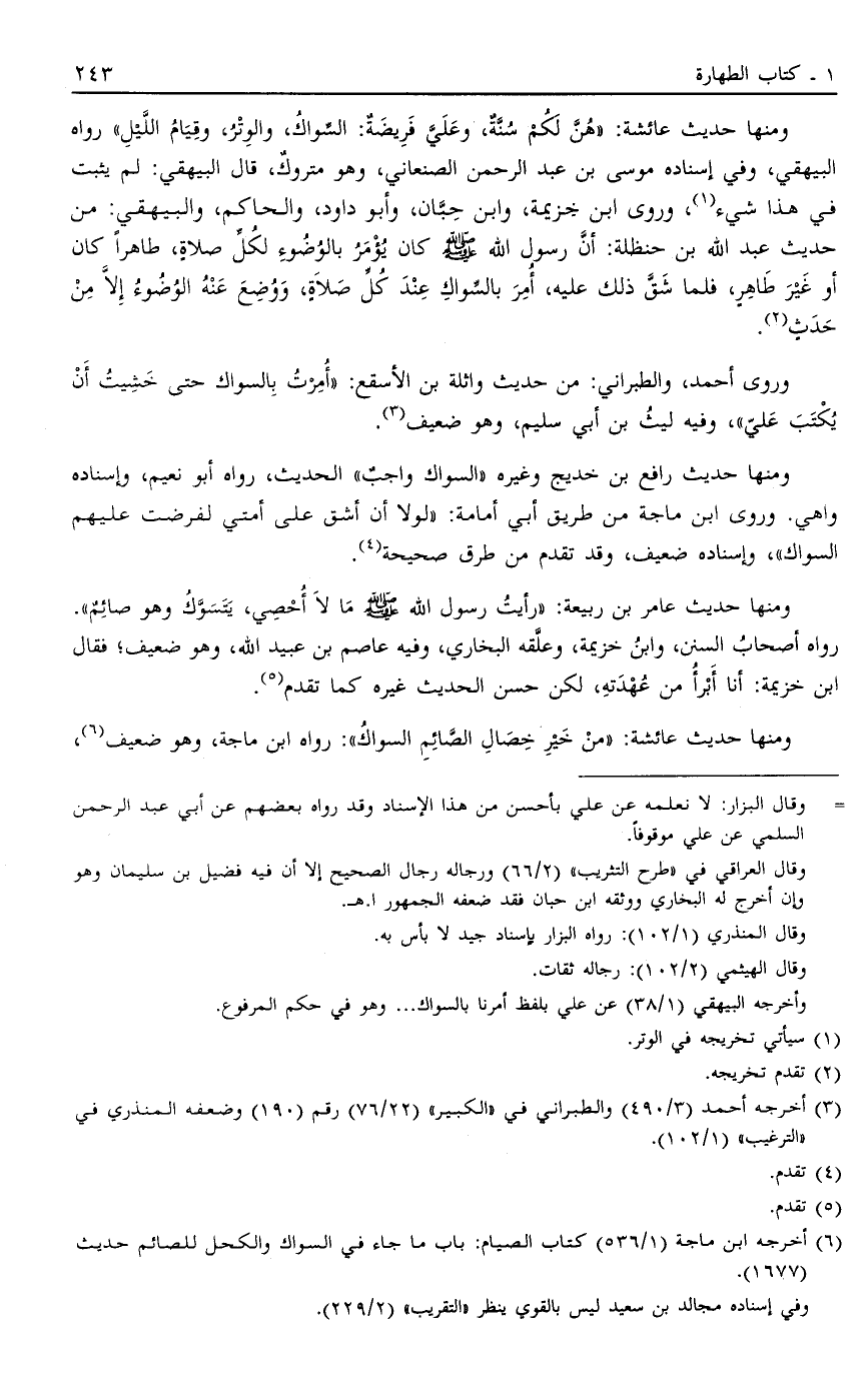 وَمِنْهَا حَدِيثُ عَامِرِ بْنِ رَبِيعَةَ: رَأَيْتُ رسول الله صَلَّى اللَّهُ عَلَيْهِ وَسَلَّمَ مالا أُحْصِي يَتَسَوَّكُ وَهُوَ صَائِمٌ رَوَاهُ أَصْحَابُ السُّنَنِ وَابْنُ خُزَيْمَةَ وَعَلَّقَهُ الْبُخَارِيُّ وَفِيهِ عَاصِمُ بْنُ عُبَيْدِ اللَّهِ وَهُوَ ضَعِيفٌ فَقَالَ ابْنُ خُزَيْمَةَ: أَنَا أَبْرَأُ مِنْ عُهْدَتِهِ لَكِنْ حَسَّنَ الْحَدِيثَ غَيْرُهُ كَمَا تَقَدَّمَ5.