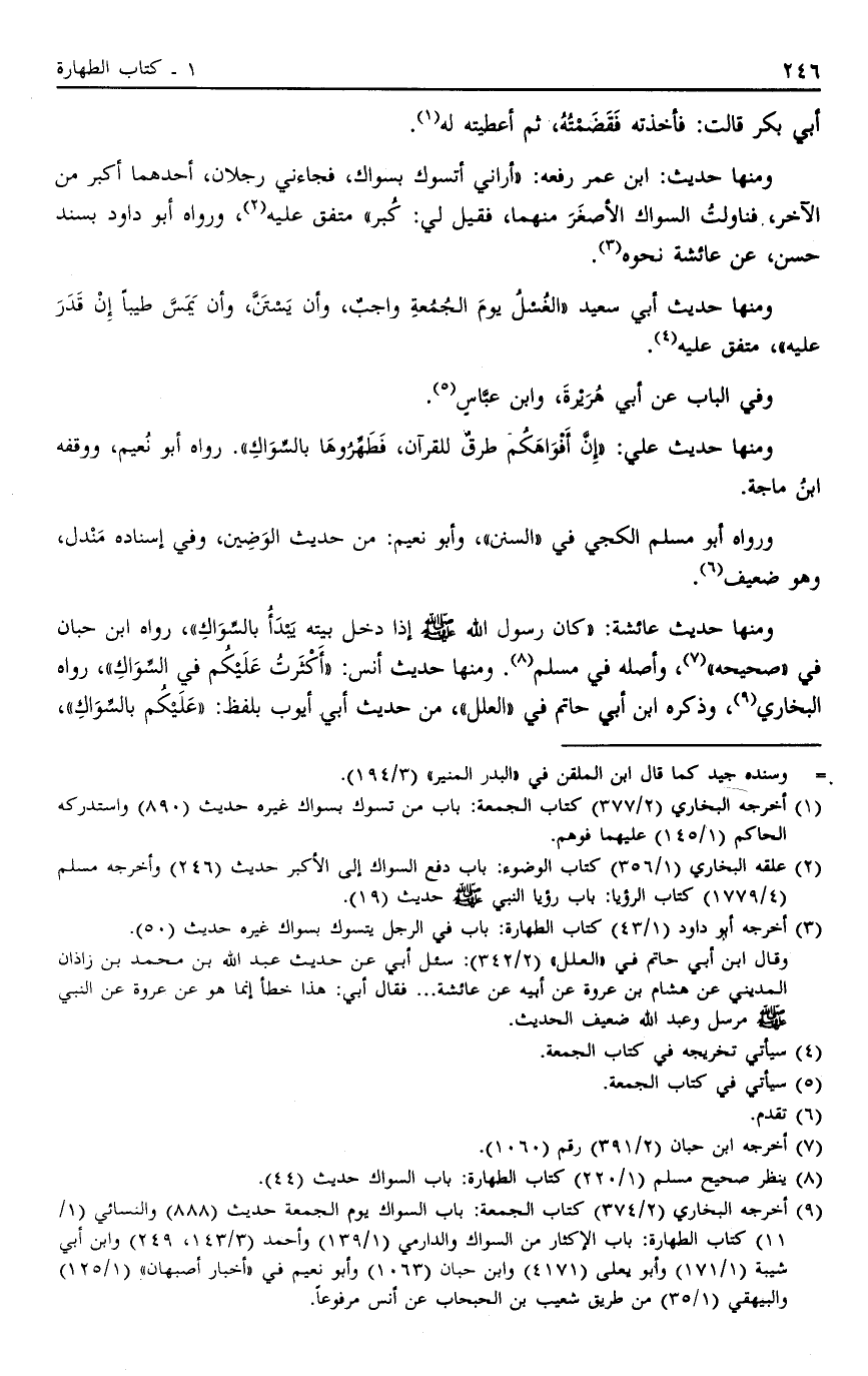 9 أخرجه البخاري "2/374" كتاب الجمعة: باب السواك يوم الجمعة حديث "888" والنسائي "1/11" كتاب الطهارة: باب الإكثار من السواك والدارمي "1/139" وأحمد "3/143، 249" وابن أبي شيبة "1/171" وأبو يعلى "4171" وابن حبان "1063" وأبو نعيم في "أخبار أصبهان" "1/125" والبيهقي "1/35" من طريق شعيب بن الحبحاب عن أنس مرفوعاً.