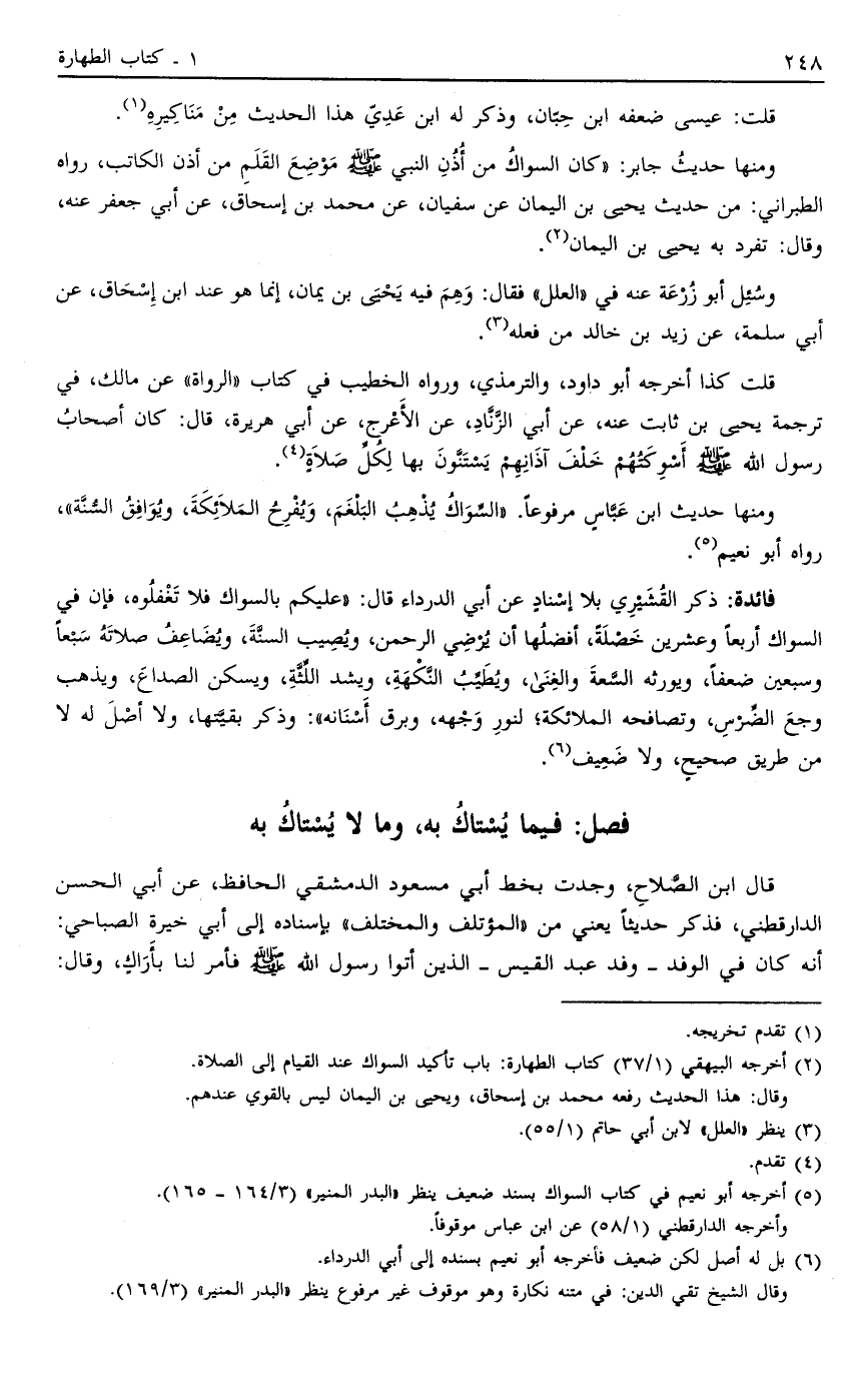 5 أخرجه أبو نعيم في كتاب السواك بسند ضعيف ينظر " البدر المنير" "3/164- 165". وأخرجه الدارقطني "1/58" عن ابن عباس موقوفاً.