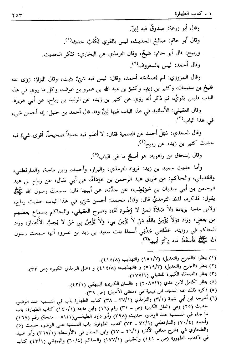 6 أخرجه ابن أبي شيبة "1/3" والترمذي "1/37- 38" كتاب الطهارة باب في التسمية عند الوضوء حديث "25" وفي "العلل الكبير" "ص- 31" رقم "16" وابن ماجة "1/140" كتاب الطهارة: باب