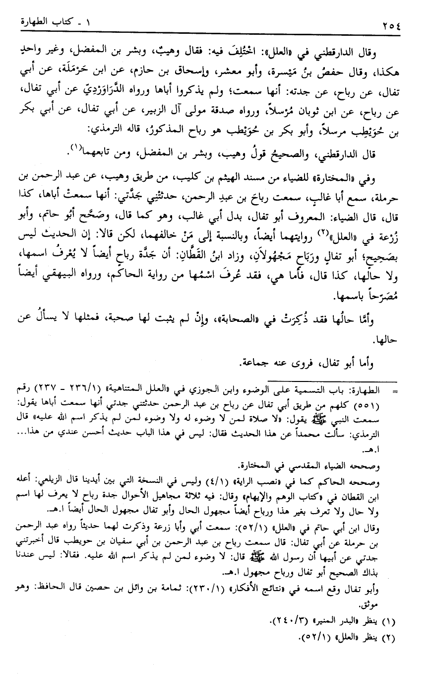 وقال ابن أبي حاتم في "العلل " "1/52": سمعت أبي وأبا زرعة وذكرت لهما حديثاً رواه عبد الرحمن بن حرملة عن أبي تفال: قال سمعت رباح بن عبد الرحمن بن أبي سفيان بن حويطب قال: أخبرتني جدتي عن أبيها أن رسول الله صَلَّى اللَّهُ عَلَيْهِ وَسَلَّمَ قال: "لا وضوء لمن لم يذكر اسم الله عليه". فقالا: ليس عندنا بذاك الصحيح أبو تفال ورباح مجهول ا. هـ.
