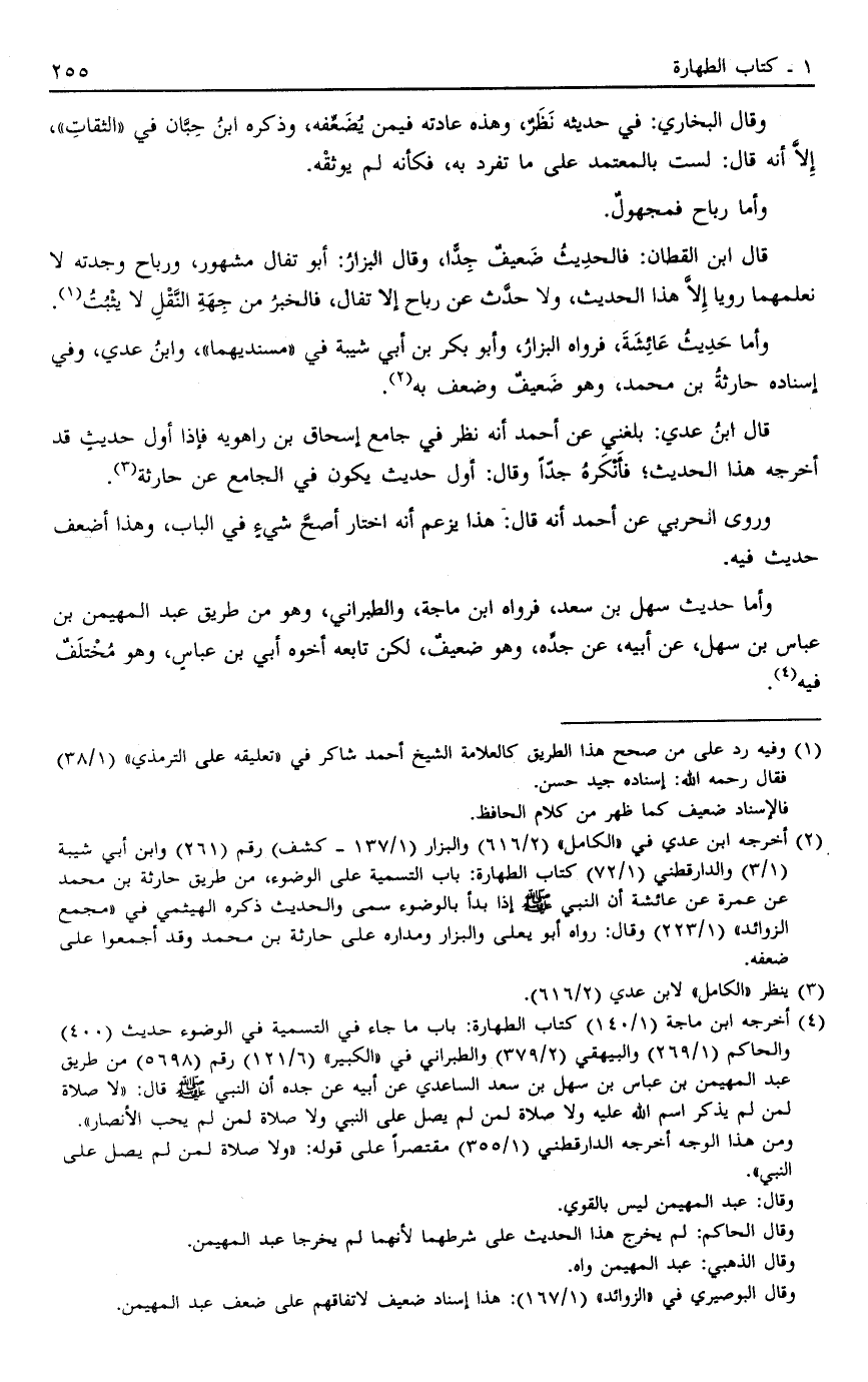 4 أخرجه ابن ماجة "1/140" كتاب الطهارة: باب ما جاء في التسمية في الوضوء حديث "400" والحاكم "1/269" والبيهقي "2/379" والطبراني في "الكبير" "6/121" رقم "5698" من طريق عبد المهيمن بن عباس بن سهل بن سعد الساعدي عن أبيه عن جده أن النبي صَلَّى اللَّهُ عَلَيْهِ وَسَلَّمَ قال: "لا صلاة لمن لم يذكر اسم الله عليه ولا صلاة لمن لم يصل على النبي صَلَّى اللَّهُ عَلَيْهِ وَسَلَّمَ ولا صلاة لمن لم يحب الأنصار".