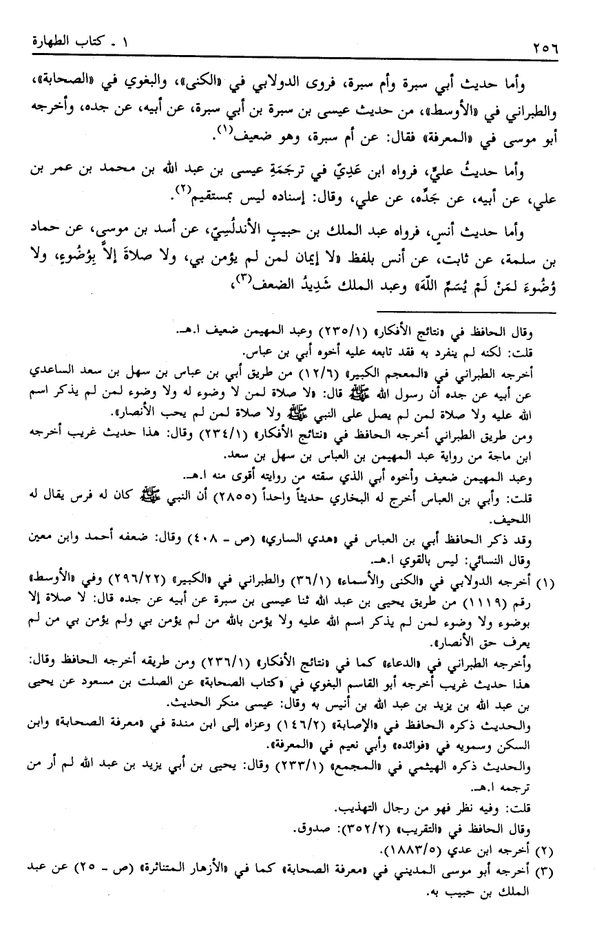وَأَمَّا حَدِيثُ أَنَسٍ فَرَوَاهُ عَبْدُ الْمَلِكِ بْنُ حَبِيبٍ الْأَنْدَلُسِيُّ عَنْ أَسَدِ بْنِ مُوسَى عَنْ حَمَّادِ بْنِ سَلَمَةَ عَنْ ثَابِتٍ عَنْ أَنَسٍ بِلَفْظِ "لَا إيمَانَ لِمَنْ لَمْ يُؤْمِنْ بِي وَلَا صَلَاةَ إلَّا بِوُضُوءٍ وَلَا وُضُوءَ لِمَنْ لَمْ يُسَمِّ اللَّهِ" وَعَبْدُ الْمَلِكِ شَدِيدُ الضَّعْفِ3.