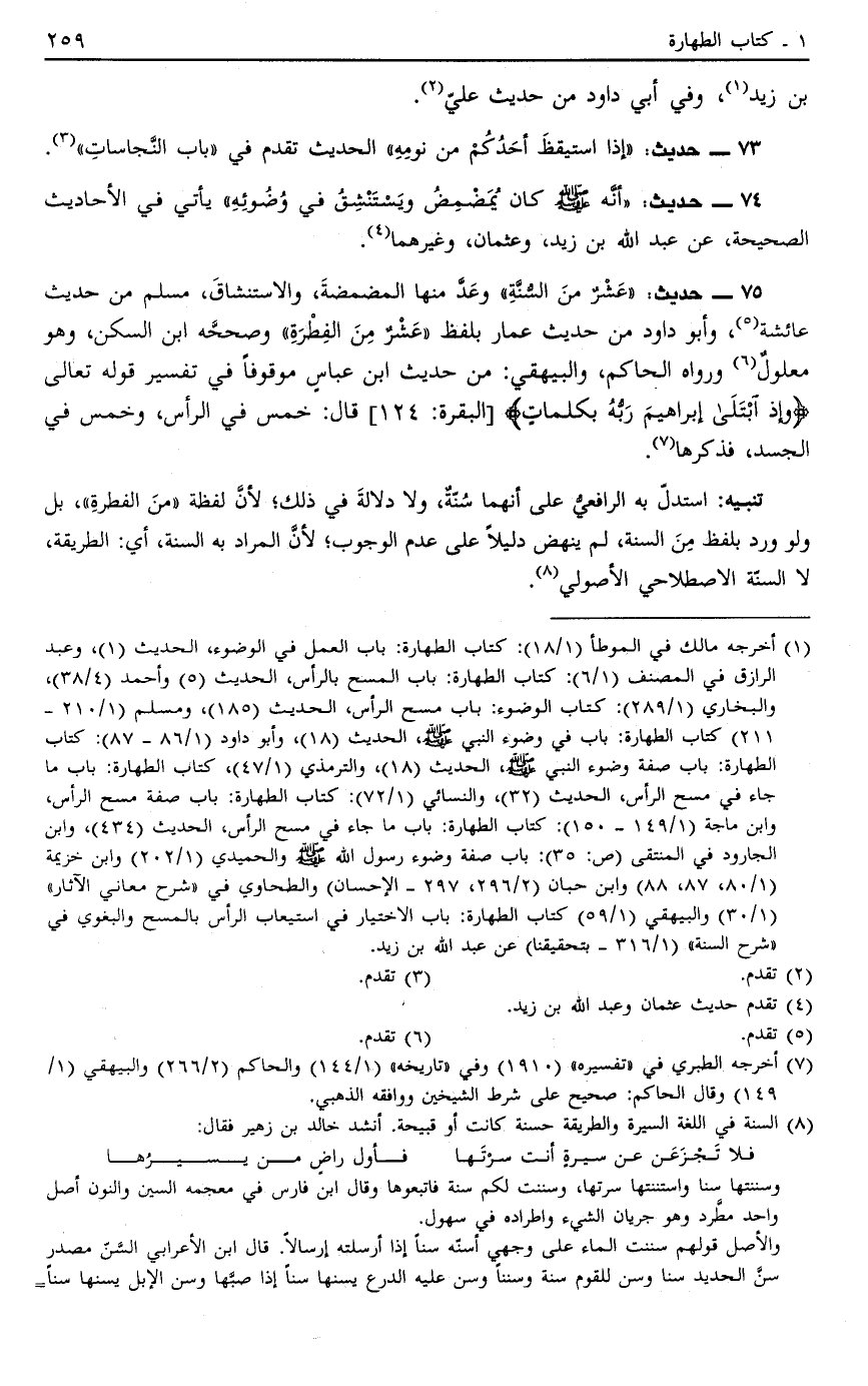 1 أخرجه مالك في الموطأ "1/18": كتاب الطهارة: باب العمل في الوضوء، الحديث "1"، وعبد الرازق في المصنف "1/6": كتاب الطهارة: باب المسح بالرأس، الحديث "5" وأحمد "4/38"، والبخاري "1/289": كتاب الوضوء: باب مسح الرأس، الحديث "185"، ومسلم "1/210-211" كتاب الطهارة: باب في وضوء النبي صَلَّى اللَّهُ عَلَيْهِ وَسَلَّمَ، الحديث "18"، وأبو داود "1/86- 87": كتاب الطهارة: باب صفة وضوء النبي صَلَّى اللَّهُ عَلَيْهِ وَسَلَّمَ، الحديث "18"، والترمذي "1/47"، كتاب الطهارة: باب ما جاء في مسح الرأس، الحديث "32"، والنسائي "1/72": كتاب الطهارة: باب صفة مسح الرأس، وابن ماجة "1/149- 150": كتاب الطهارة: باب ما جاء في مسح الرأس، الحديث "434"، وابن الجارود في المنتقى "ص: 35": باب صفة وضوء رسول الله صَلَّى اللَّهُ عَلَيْهِ وَسَلَّمَ والحميدي "1/202" وابن خزيمة"1/80، 87، 88" وابن حبان "2/296، 297- الإحسان" والطحاوي في "شرح معاني الآثار" "1/30" والبيهقي "1/59" كتاب الطهارة: باب الاختيار في استيعاب الرأس بالمسح والبغوي في "شرح السنة " "1/316- بتحقيقنا" عن عبد الله بن زيد.