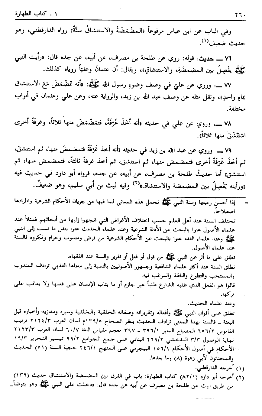 79 - وَرُوِيَ عَنْ عَبْدِ اللَّهِ بْنِ زَيْدٍ فِي حَدِيثِهِ أَنَّهُ أَخَذَ غَرْفَةً فَتَمَضْمَضَ مِنْهَا ثُمَّ اسْتَنْشَقَ ثُمَّ أَخَذَ غَرْفَةً أُخْرَى فَتَمَضْمَضَ مِنْهَا ثُمَّ اسْتَنْشَقَ ثُمَّ أَخَذَ غَرْفَةً ثَالِثَةً فَتَمَضْمَضَ مِنْهَا ثُمَّ اسْتَنْشَقَ أَمَّا حَدِيثُ طَلْحَةَ بْنِ مُصَرِّفٍ عَنْ أَبِيهِ عَنْ جَدِّهِ فَرَوَاهُ أَبُو دَاوُد فِي حَدِيثٍ فِيهِ: وَرَأَيْته يَفْصِلُ بَيْنَ الْمَضْمَضَةِ وَالِاسْتِنْشَاقِ2 وَفِيهِ لَيْثُ بْنُ أَبِي سُلَيْمٍ وَهُوَ ضَعِيفٌ.