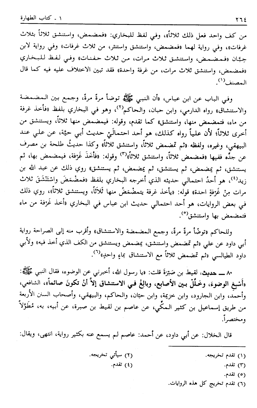 80 - حَدِيثُ لَقِيطِ بْنِ صُبْرَةَ قُلْت: يَا رَسُولَ اللَّهِ أَخْبِرْنِي عَنْ الْوُضُوءِ فَقَالَ النَّبِيُّ صَلَّى اللَّهُ عَلَيْهِ وَسَلَّمَ: "أَسْبِغْ الْوُضُوءَ وَخَلِّلْ بَيْنَ الْأَصَابِعِ وَبَالِغْ فِي الِاسْتِنْشَاقِ إلَّا أَنْ تَكُونَ صَائِمًا" الشَّافِعِيُّ وَأَحْمَدُ وَابْنُ الْجَارُودِ وَابْنُ خُزَيْمَةَ وَابْنُ حِبَّانَ وَالْحَاكِمُ وَالْبَيْهَقِيُّ وَأَصْحَابُ السُّنَنِ الْأَرْبَعَةُ مِنْ طَرِيقِ إسْمَاعِيلِ بْنِ كَثِيرٍ الْمَكِّيِّ عَنْ عَاصِمِ بْنِ لَقِيطِ بْنِ صُبْرَةَ عَنْ أَبِيهِ بِهِ مُطَوَّلًا وَمُخْتَصَرًا.