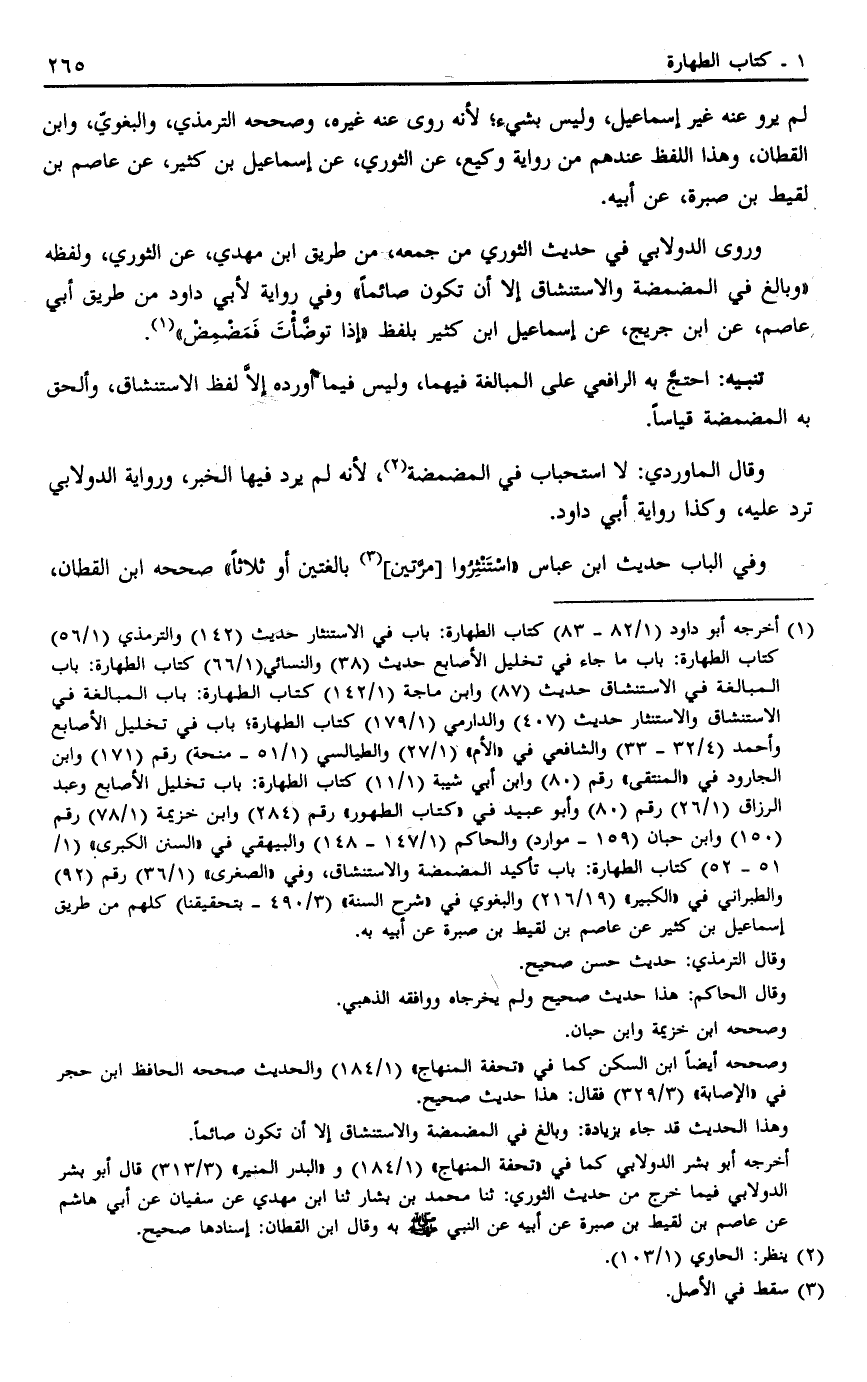 1 أخرجه أبو داود "82/1- 83" كتاب الطهارة: باب في الاستنثار حديث "142" والترمذي "1/56" كتاب الطهارة: باب ما جاء في تخليل الأصابع حديث "38" والنسائي "1/66" كتاب الطهارة: باب المبالغة في الاستنشاق حديث "87" وابن ماجة "1/142" كتاب الطهارة: باب المبالغة في الاستنشاق والاستنثار حديث "407" والدارمي "1/179" كتاب الطهارة؟ باب في تخليل الأصابع وأحمد "4/32- 33" والشافعي في "الأم""1/27" والطيالسي "1/51- منحة" رقم "171" وابن الجارود في "المنتقى" رقم "80" وابن أبي شيبة "1/11" كتاب الطهارة: باب تخليل الأصابع وعبد الرزاق "1/26" رقم "80" وأبو عبيد في "كتاب الطهور" رقم "284" وابن خزيمة "1/78" رقم "150" وابن حبان "159- موارد" والحاكم "1/147- 48 1" والبيهقي في "السنن الكبرى" "1/51- 52" كتاب الطهارة: باب تأكيد المضمضة والاستنشاق، وفي "الصغرى" "1/36" رقم "92" والطبراني في "الكبير" "19/216" والبغوي في "شرح السنة" "3/490- بتحقيقنا" كلهم من طريق إسماعيل بن كثير عن عاصم بن لقيط بن صبرة عن أبيه به.