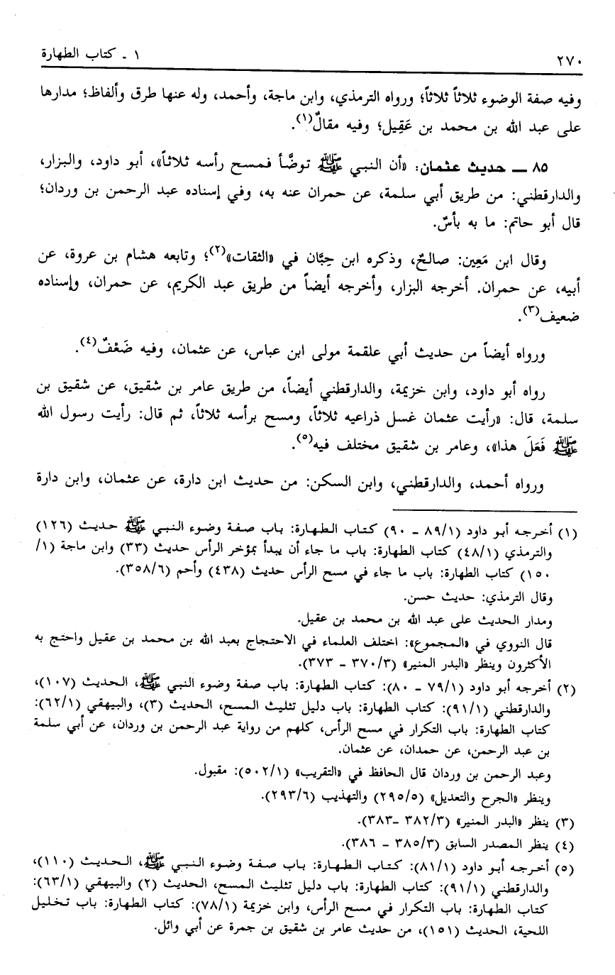 85 - حَدِيثُ عُثْمَانَ: أَنَّ النَّبِيَّ صَلَّى اللَّهُ عَلَيْهِ وَسَلَّمَ تَوَضَّأَ فَمَسَحَ رَأْسَهُ ثَلَاثًا أَبُو دَاوُد وَالْبَزَّارُ وَالدَّارَقُطْنِيّ: مِنْ طَرِيقِ أَبِي سَلَمَةَ عَنْ حُمْرَانَ عَنْهُ بِهِ وَفِي إسْنَادِهِ عَبْدُ الرَّحْمَنِ بْنُ وَرْدَانَ قَالَ أَبُو حَاتِمٍ مَا بِهِ بَأْسٌ.