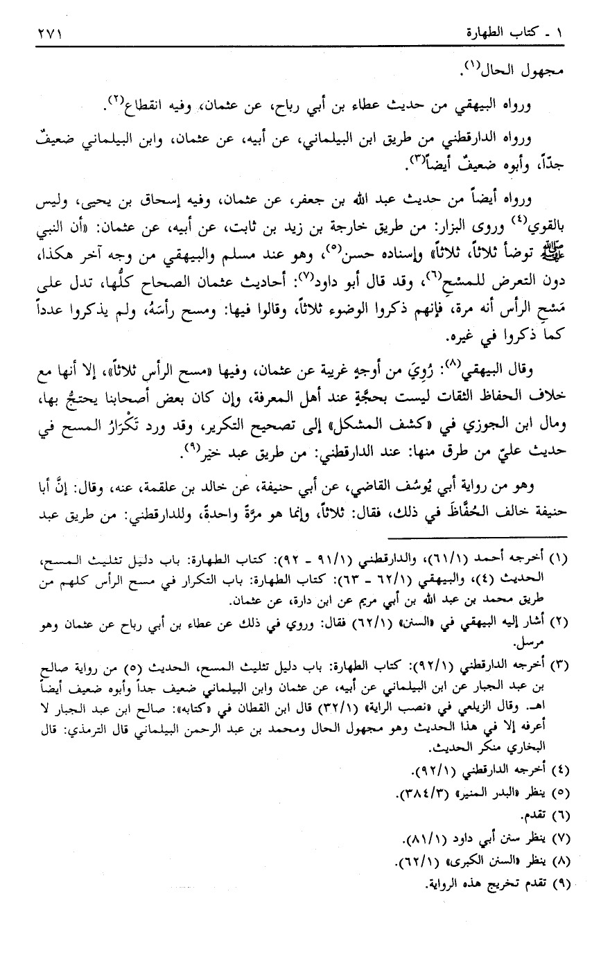 1 أخرجه أحمد "1/61"، والدارقطني "1/91- 92": كتاب الطهارة: باب دليل تثليث المسح، الحديث "4"، والبيهقي "1/62- 63": كتاب الطهارة: باب التكرار في مسح الرأس كلهم من طريق محمد بن عبد الله بن أبي مريم عن ابن دارة، عن عثمان.