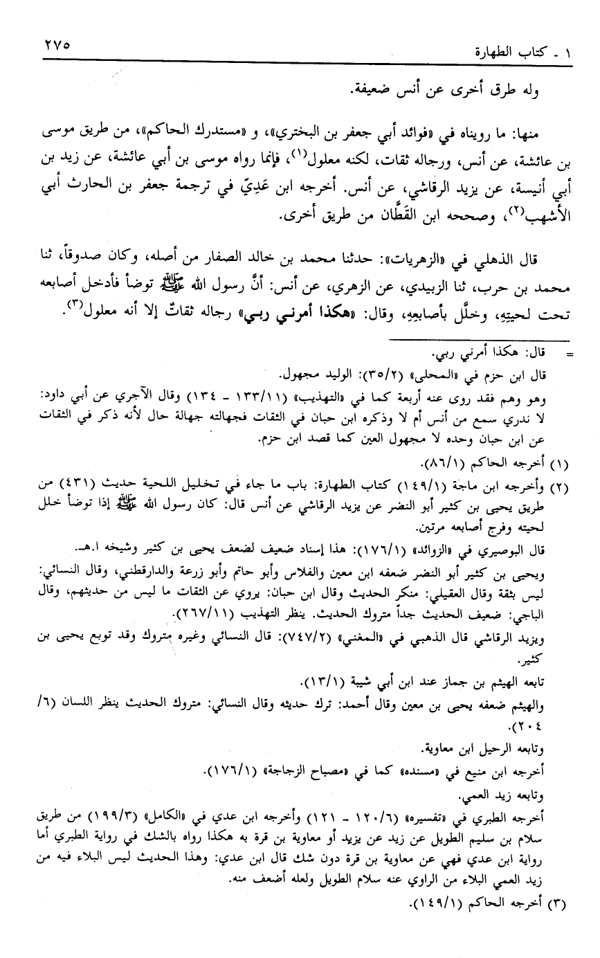 قال الذهلي فِي الزَّهْرِيَّاتِ: حَدَّثَنَا مُحَمَّدُ بْنُ خَالِدٍ الصَّفَّارُ مِنْ أَصْلِهِ وَكَانَ صَدُوقًا ثَنَا مُحَمَّدُ بْنُ حَرْبٍ ثَنَا الزُّبَيْدِيُّ عَنْ الزُّهْرِيِّ عَنْ أَنَسٍ أَنَّ رَسُولَ اللَّهِ صَلَّى اللَّهُ عَلَيْهِ وَسَلَّمَ تَوَضَّأَ فَأَدْخَلَ أَصَابِعَهُ تَحْتَ لِحْيَتِهِ وَخَلَّلَ بِأَصَابِعِهِ وَقَالَ: "هَكَذَا أَمَرَنِي رَبِّي" رِجَالُهُ ثِقَاتٌ إلَّا أَنَّهُ مَعْلُول3.