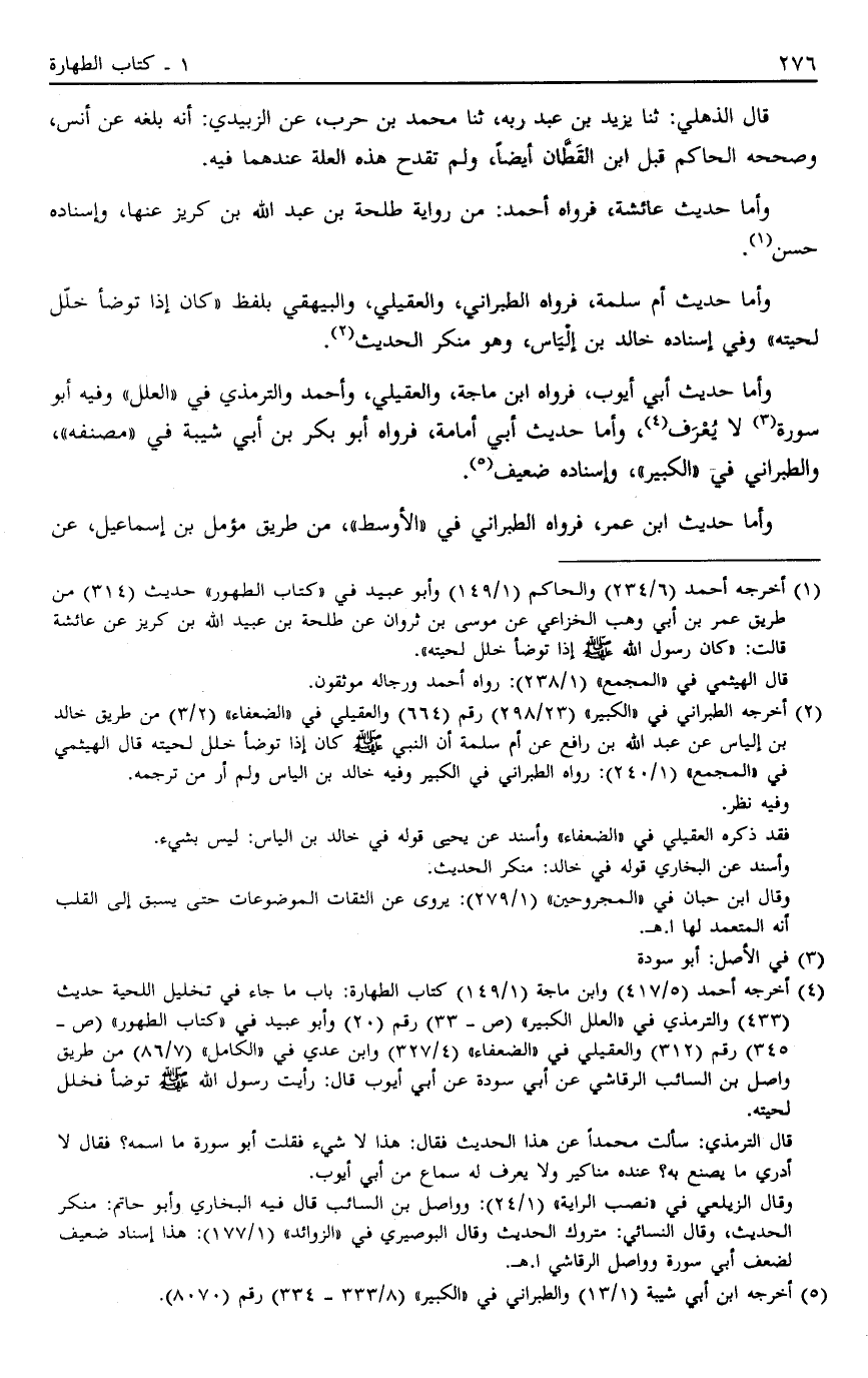 2 أخرجه الطبراني في " الكبير" "23/298" رقم "664" والعقيلي في " الضعفاء""312" من طريق خالد بن إلياس عن عبد الله بن رافع عن أم سلمة: أن النبي صَلَّى اللَّهُ عَلَيْهِ وَسَلَّمَ كان إذا توضأ خلل لحيته, قال الهيثمي في "المجمع" "1/240": رواه الطبراني في الكبير وفيه خالد بن الياس ولم أر من ترجمه.