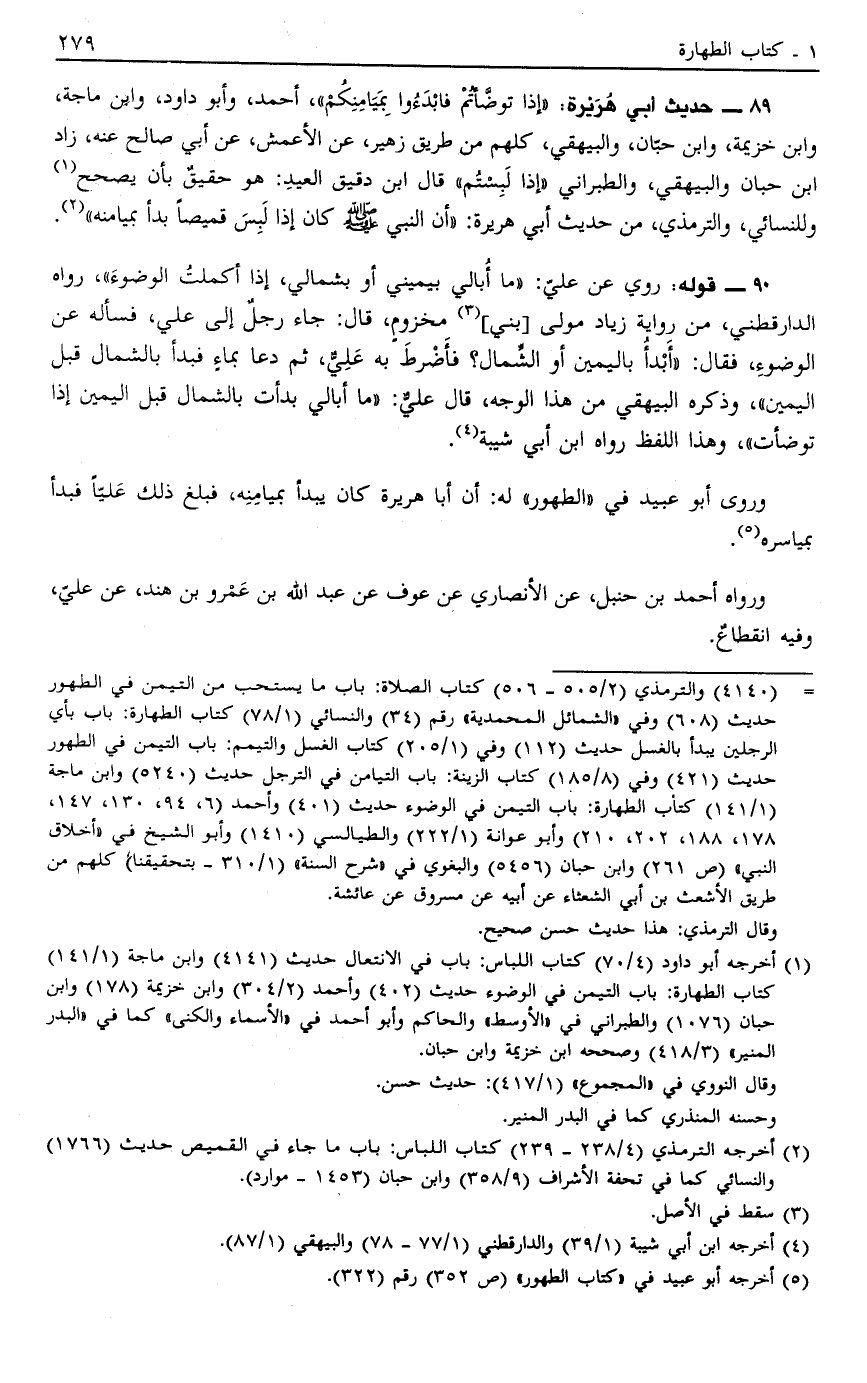 89 - حَدِيثُ أَبِي هُرَيْرَةَ: "إذَا تَوَضَّأْتُمْ فَابْدَءُوا بِمَيَامِنِكُمْ" أَحْمَدُ وَأَبُو دَاوُد وَابْنُ مَاجَهْ وَابْنُ خُزَيْمَةَ وَابْنُ حِبَّانَ وَالْبَيْهَقِيُّ كُلُّهُمْ مِنْ طَرِيقِ زُهَيْرٍ عَنْ الْأَعْمَشِ عَنْ أَبِي صَالِحٍ عَنْهُ زَادَ ابْنُ حِبَّانَ وَالْبَيْهَقِيُّ وَالطَّبَرَانِيُّ: "إذَا لَبِسْتُمْ" قَالَ ابْنُ دَقِيقِ الْعِيدِ هُوَ حَقِيقٌ بِأَنْ يُصَحَّحَ1 وَلِلنَّسَائِيِّ وَالتِّرْمِذِيِّ مِنْ حَدِيثِ أَبِي هُرَيْرَةَ: أَنَّ النَّبِيَّ صَلَّى اللَّهُ عَلَيْهِ وَسَلَّمَ كَانَ إذَا لَبِسَ قَمِيصًا بَدَأَ بِمَيَامِنِهِ2.