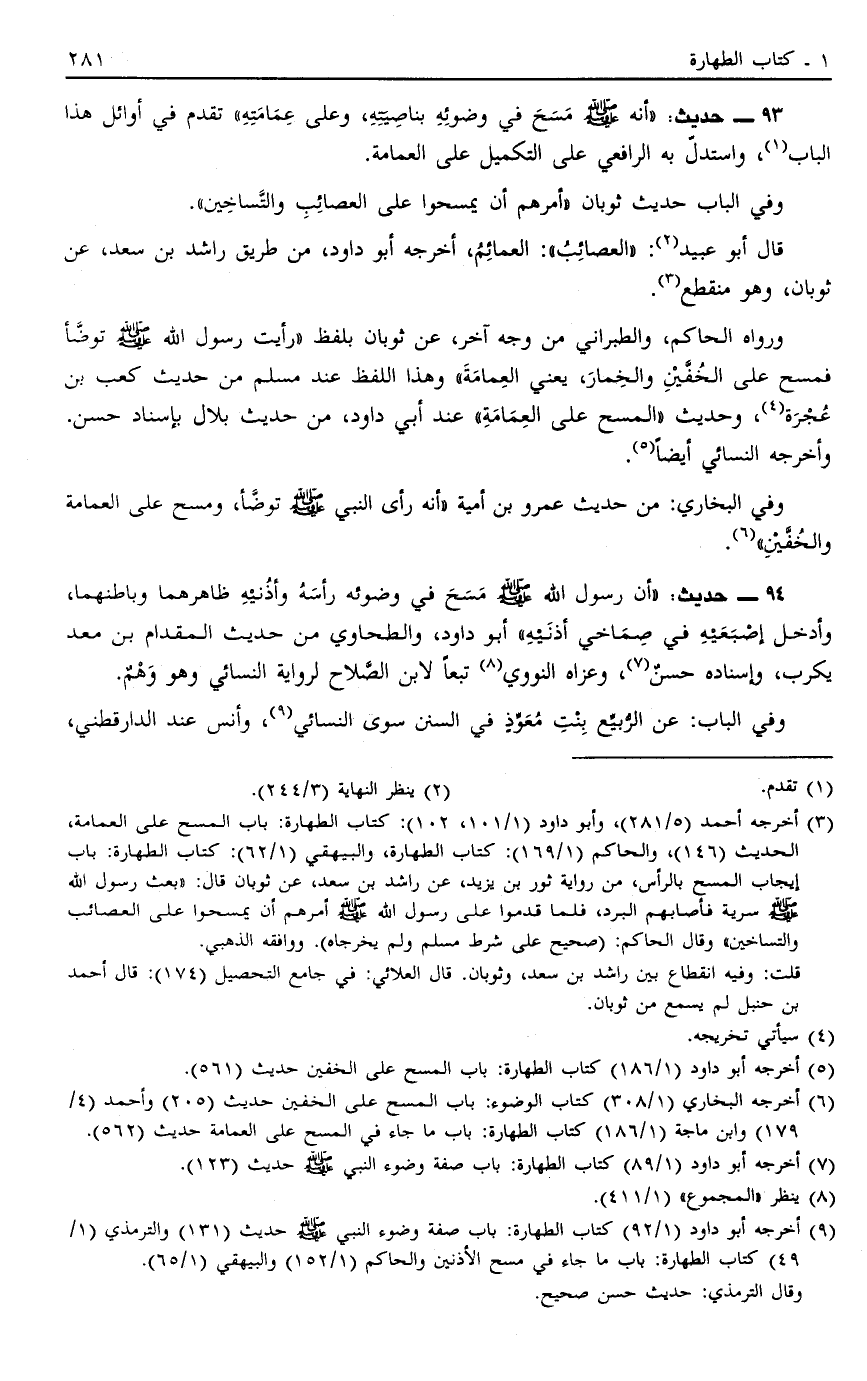 93 - حَدِيثُ: أَنَّهُ صَلَّى اللَّهُ عَلَيْهِ وَسَلَّمَ مَسَحَ فِي وُضُوئِهِ بِنَاصِيَتِهِ وَعَلَى عِمَامَتِهِ, تَقَدَّمَ فِي أَوَائِلِ هَذَا الْبَابِ1 وَاسْتَدَلَّ بِهِ الرَّافِعِيُّ عَلَى التَّكْمِيلِ عَلَى الْعِمَامَةِ.