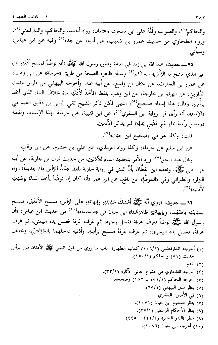 95 - حَدِيثُ: عَبْدِ اللَّهِ بْنِ زَيْدٍ فِي صِفَةِ وُضُوءِ رَسُولِ اللَّهِ صَلَّى اللَّهُ عَلَيْهِ وَسَلَّمَ: أَنَّهُ تَوَضَّأَ فَمَسَحَ أُذُنَيْهِ بِمَاءٍ غَيْرِ الَّذِي مَسَحَ بِهِ الرَّأْسَ, الْحَاكِمُ4 بِإِسْنَادٍ ظَاهِرُهُ الصِّحَّةُ مِنْ طَرِيقِ حَرْمَلَةَ عَنْ ابْنِ وَهْبٍ عَنْ عَمْرِو بْنِ الْحَارِثِ عَنْ حِبَّانَ بْنِ وَاسِعٍ عن أبيه عنه أخرجه الْبَيْهَقِيُّ مِنْ طَرِيقِ عُثْمَانَ الدَّارِمِيِّ عَنْ الْهَيْثَمِ بْنِ خَارِجَةَ عَنْ ابْنِ وَهْبٍ بِلَفْظِ: فَأَخَذَ لِأُذُنَيْهِ مَاءً خِلَافَ الْمَاءِ الَّذِي أَخَذَ لِرَأْسِهِ, وَقَالَ هَذَا إسْنَادٌ صَحِيحٌ5 انْتَهَى لَكِنْ ذَكَرَ الشَّيْخُ تَقِيُّ الدِّينِ بْنُ دقيق العيد في الإمام أَنَّهُ رَأَى فِي رِوَايَةِ ابْنِ الْمُقْرِي6 عَنْ ابْنِ قُتَيْبَةَ عَنْ حَرْمَلَةَ بِهَذَا الْإِسْنَادِ وَلَفْظُهُ: وَمَسَحَ رَأْسَهُ بِمَاءٍ غَيْرِ فَضْلِ يَدَيْهِ لَمْ يَذْكُرْ الْأُذُنَيْنِ.