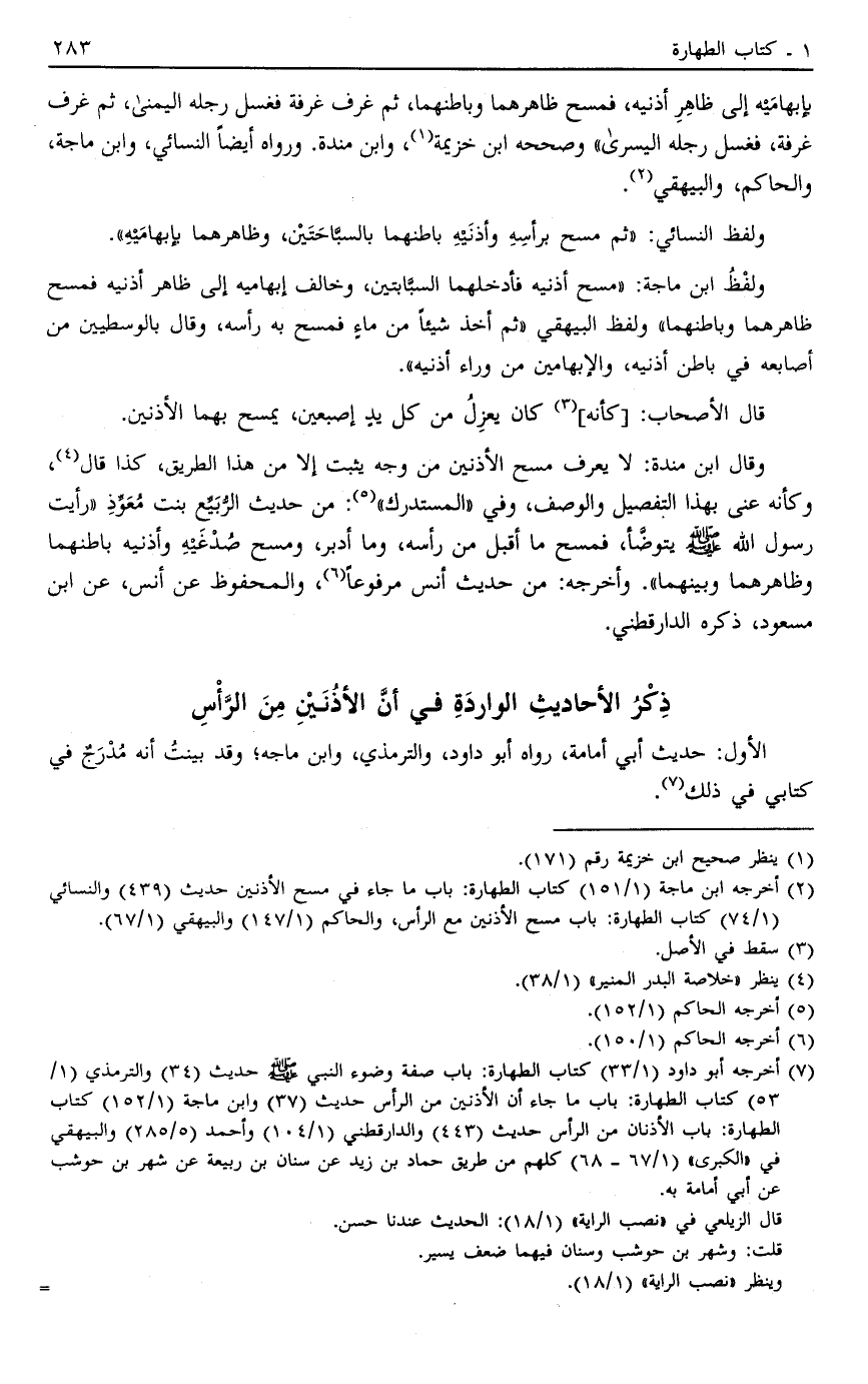 2 أخرجه ابن ماجة "1/151" كتاب الطهارة: باب ما جاء في مسح الأذنين حديث "439" والنسائي "1/74" كتاب الطهارة: باب مسح الأذنين مع الرأس، والحاكم "1/147" والبيهقي "1/67".