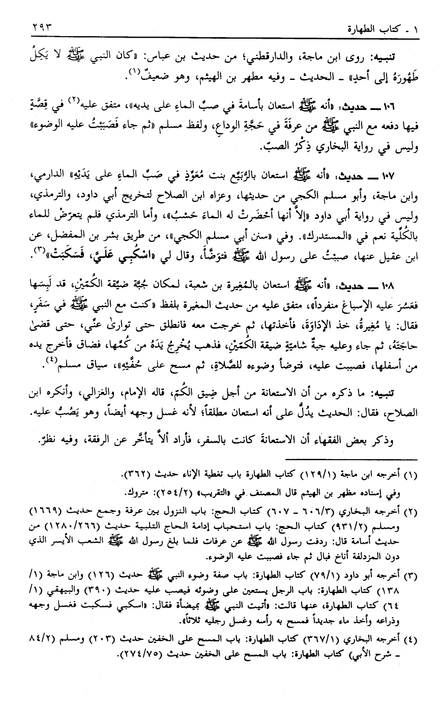 106 - حَدِيثُ أَنَّهُ صَلَّى اللَّهُ عَلَيْهِ وَسَلَّمَ اسْتَعَانَ بِأُسَامَةَ فِي صَبِّ الْمَاءِ عَلَى يَدَيْهِ مُتَّفَقٌ عَلَيْهِ2 فِي قِصَّةٍ فِيهَا دَفْعُهُ مَعَ النَّبِيِّ صَلَّى اللَّهُ عَلَيْهِ وَسَلَّمَ مِنْ عَرَفَةَ فِي حَجَّةِ الْوَدَاعِ وَلَفْظُ مُسْلِمٍ ثُمَّ جَاءَ فَصَبَبْتُ عَلَيْهِ الْوُضُوءَ وَلَيْسَ فِي رِوَايَةِ الْبُخَارِيِّ ذِكْرُ الصَّبِّ.