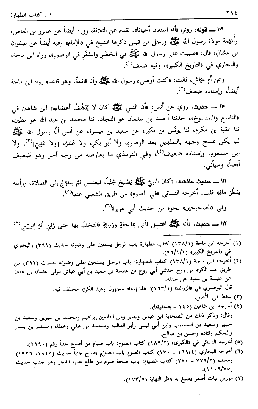 109 - قَوْلُهُ: رُوِيَ: أَنَّهُ اسْتَعَانَ أَحْيَانًا تَقَدَّمَ عَنْ الثَّلَاثَةِ وَوَرَدَ أَيْضًا عَنْ عَمْرِو بْنِ الْعَاصِ وَأُمَيْمَةَ مَوْلَاةِ رَسُولِ اللَّهِ صَلَّى اللَّهُ عَلَيْهِ وَسَلَّمَ وَرَجُلٍ مِنْ قَيْسٍ ذَكَرَهَا الشَّيْخُ في الإمام وَفِيهِ أَيْضًا عَنْ صَفْوَانَ بْنِ عَسَّالٍ قَالَ: صَبَبْتُ عَلَى رَسُولِ اللَّهِ صَلَّى اللَّهُ عَلَيْهِ وَسَلَّمَ فِي الْحَضَرِ وَالسَّفَرِ فِي الْوُضُوءِ, رَوَاهُ ابْنُ مَاجَهْ وَالْبُخَارِيُّ فِي التَّارِيخِ الْكَبِيرِ وَفِيهِ ضَعْفٌ1.