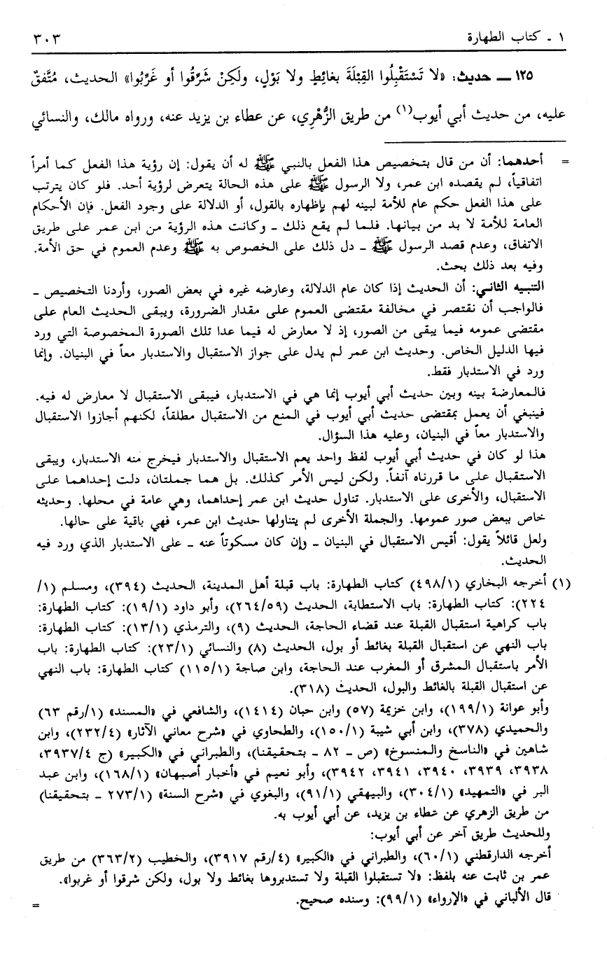 125 - حَدِيثُ: "لَا تَسْتَقْبِلُوا الْقِبْلَةَ بِغَائِطٍ وَلَا بَوْلٍ وَلَكِنْ شَرِّقُوا أَوْ غَرِّبُوا" الْحَدِيثُ مُتَّفِقٌ عَلَيْهِ مِنْ حَدِيثِ أَبِي أَيُّوبَ1 مِنْ طَرِيقِ الزُّهْرِيِّ عَنْ عَطَاءِ بْنِ يَزِيدَ عَنْهُ وَرَوَاهُ مَالِكٌ وَالنَّسَائِيُّ