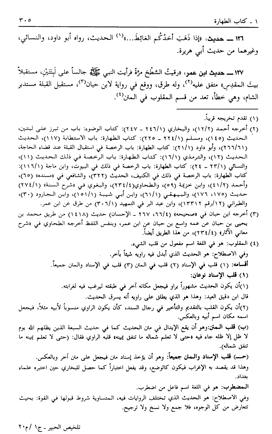 127 - حَدِيثُ ابْنِ عُمَرَ رَقَيْتُ السَّطْحَ مَرَّةً فَرَأَيْتُ النَّبِيَّ صَلَّى اللَّهُ عَلَيْهِ وَسَلَّمَ جَالِسًا عَلَى لَبِنَتَيْنِ مُسْتَقْبِلًا بَيْتَ الْمَقْدِسِ مُتَّفَقٌ عَلَيْهِ2 وَلَهُ طُرُقٌ وَوَقَعَ فِي رِوَايَةٍ لِابْنِ حِبَّانَ3 مُسْتَقْبِلَ الْقِبْلَةِ مُسْتَدْبِرَ الشَّامِ وَهِيَ خَطَأٌ تُعَدُّ مِنْ قِسْمِ الْمَقْلُوبِ فِي الْمَتْنِ4.