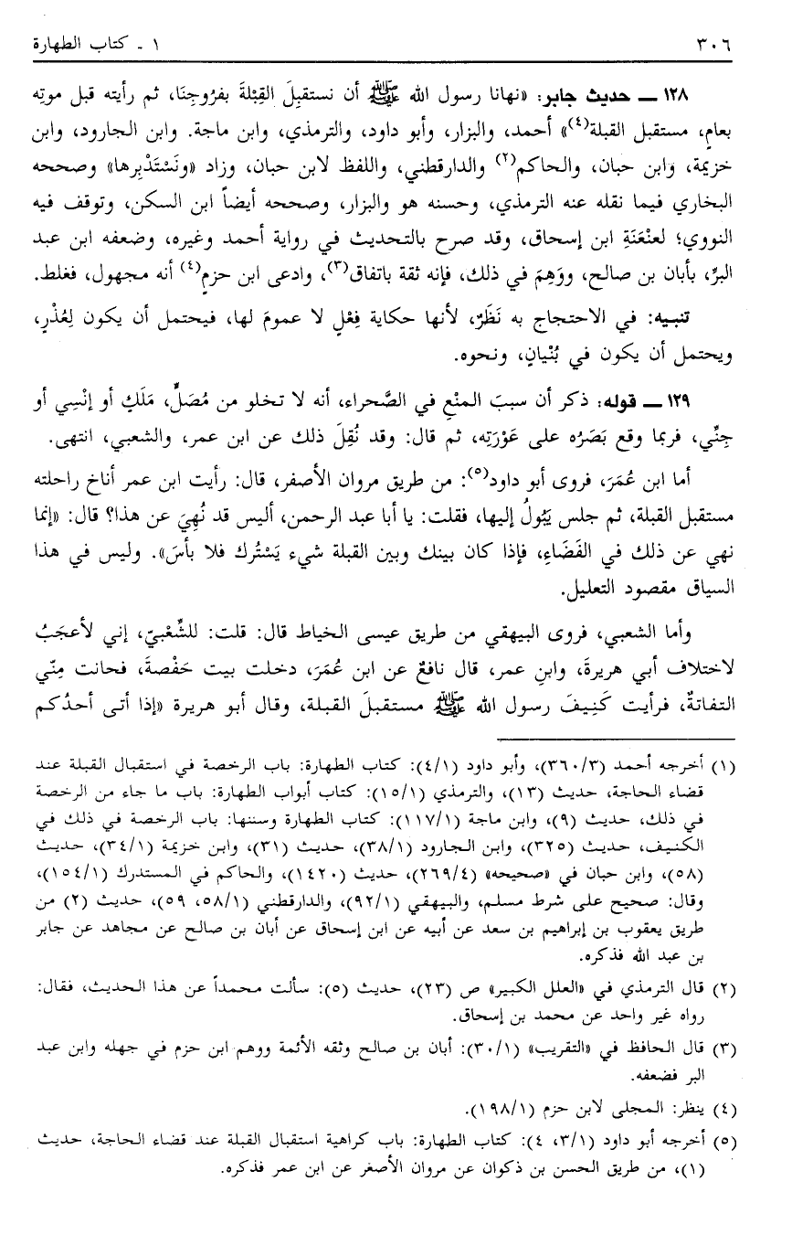 128 - حَدِيثُ جَابِرٍ: نَهَانَا رَسُولُ اللَّهِ صَلَّى اللَّهُ عَلَيْهِ وَسَلَّمَ أَنْ نَسْتَقْبِلَ الْقِبْلَةَ بِفُرُوجِنَا ثُمَّ رَأَيْتُهُ قَبْلَ مَوْتِهِ بِعَامٍ مُسْتَقْبِلَ الْقِبْلَةِ1 أَحْمَدُ وَالْبَزَّارُ وَأَبُو دَاوُد وَالتِّرْمِذِيُّ وَابْنُ مَاجَهْ وَابْنُ الْجَارُودِ وَابْنُ خُزَيْمَةَ وَابْنُ حِبَّانَ وَالْحَاكِمُ2 وَالدَّارَقُطْنِيّ وَاللَّفْظُ لِابْنِ حِبَّانَ وَزَادَ وَنَسْتَدْبِرُهَا وَصَحَّحَهُ الْبُخَارِيُّ فِيمَا نَقَلَهُ عَنْهُ التِّرْمِذِيُّ وَحَسَّنَهُ هُوَ وَالْبَزَّارُ وَصَحَّحَهُ أَيْضًا ابْنُ السَّكَنِ وَتَوَقَّفَ فِيهِ النَّوَوِيُّ لِعَنْعَنَةِ ابْنِ إِسْحَاقَ وَقَدْ صَرَّحَ بِالتَّحْدِيثِ فِي رِوَايَةِ أَحْمَدَ وَغَيْرِهِ وَضَعَّفَهُ ابْنُ عَبْدِ الْبَرِّ بِأَبَانَ بْنِ صَالِحٍ وَوَهِمَ فِي ذَلِكَ فَإِنَّهُ ثِقَةٌ بِاتِّفَاقٍ3 وَادَّعَى ابْنُ حَزْمٍ4 أَنَّهُ مَجْهُولٌ فَغَلِطَ.