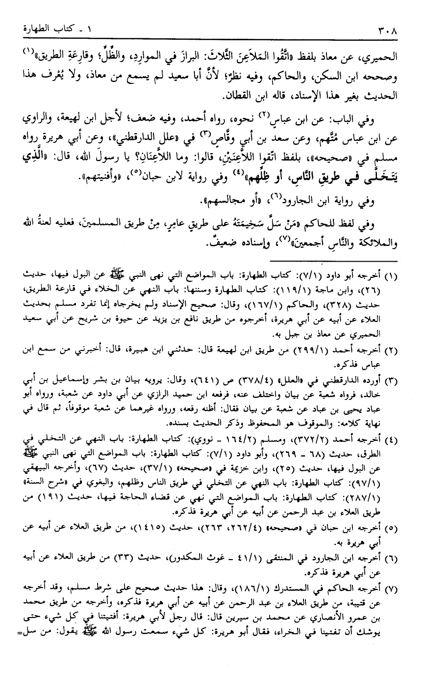 1 أخرجه أبو داود."1/7": كتاب الطهارة: باب المواضع التي نهى النبي صَلَّى اللَّهُ عَلَيْهِ وَسَلَّمَ عن البول فيها، حديث "26"، وابن ماجة "1/119": كتاب الطهارة وسننها: باب النهي عن الخلاء في قارعة الطريق، حديث "328"، والحاكم "1/167"، وقال: صحيح الإسناد ولم يخرجاه إنما تفرد مسلم بحديث العلاء عن أبيه عن أبي هريرة، أخرجوه من طريق نافع بن يزيد عن حيوة بن شريح عن أبي سعيد الحميري عن محاذ بن جبل به.