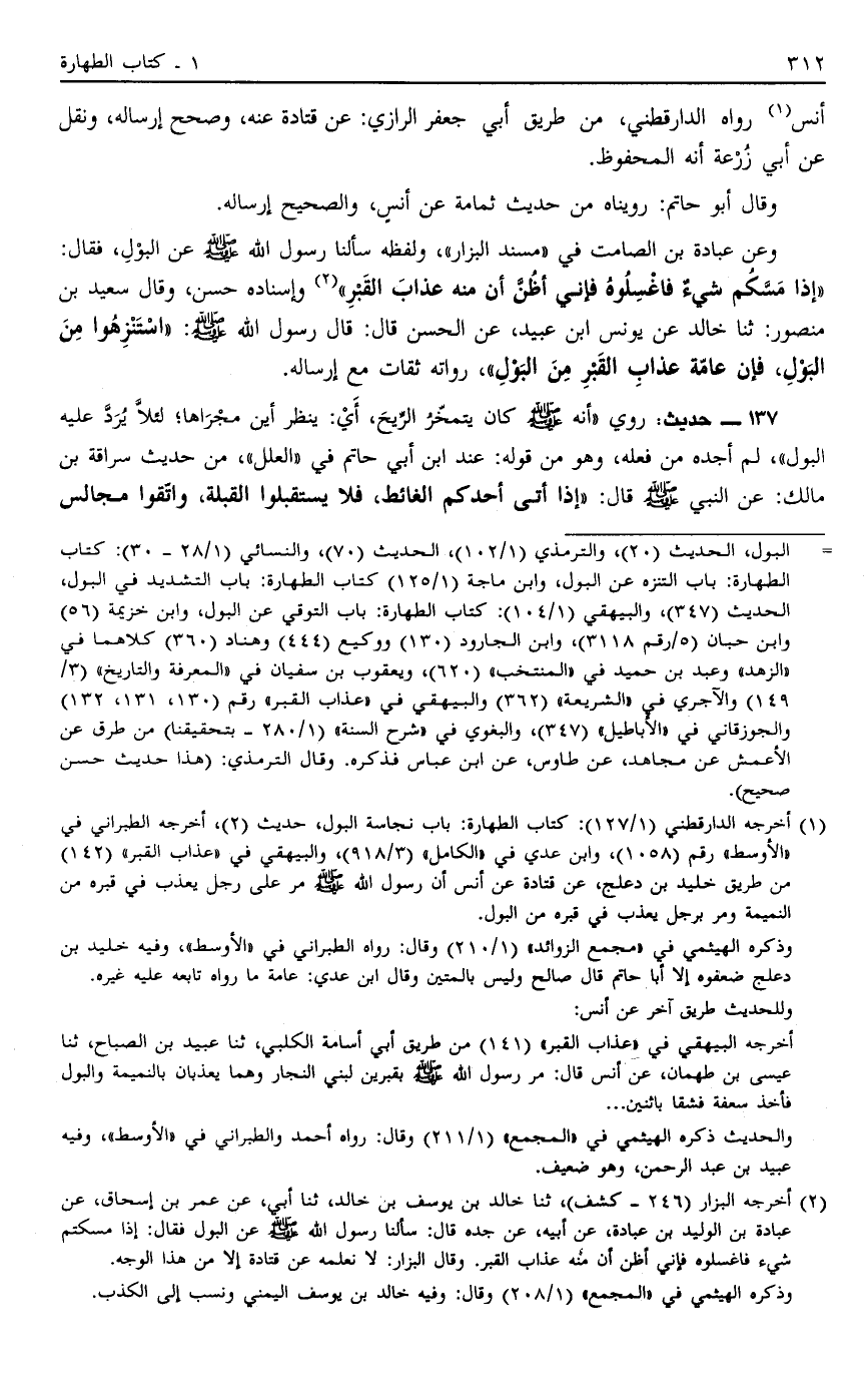1 أخرجه الدارقطني "1/127": كتاب الطهارة: باب نجاسة البول، حديث "2"، أخرجه الطبراني في "الأوسط" رقم "1058"، وابن عدي في " الكامل" "3/918"، والبيهقي في "عذاب القبر" "142" من طريق خليد بن دعلج، عن قتادة عن أنس أن رسول الله صَلَّى اللَّهُ عَلَيْهِ وَسَلَّمَ مر على رجل يعذب في قبره من النميمة ومر يرجل يعذب في قبره من البول.