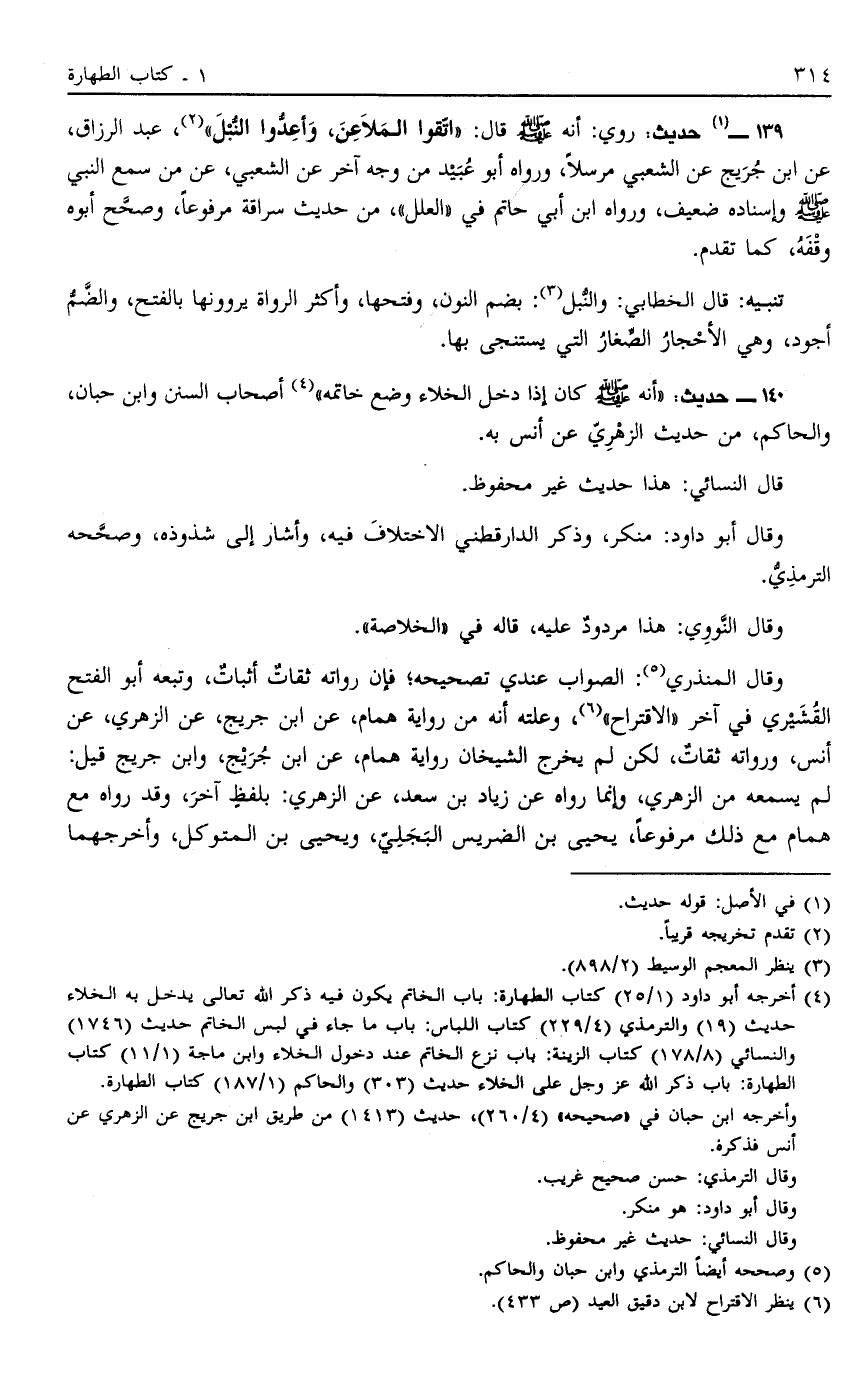 140 - حَدِيثُ: أَنَّهُ صَلَّى اللَّهُ عَلَيْهِ وَسَلَّمَ كَانَ إذَا دَخَلَ الْخَلَاءَ وَضَعَ خَاتَمَهُ,4 أَصْحَابُ السُّنَنِ وَابْنُ حِبَّانَ وَالْحَاكِمُ مِنْ حَدِيثِ الزُّهْرِيِّ عَنْ أَنَسٍ بِهِ.