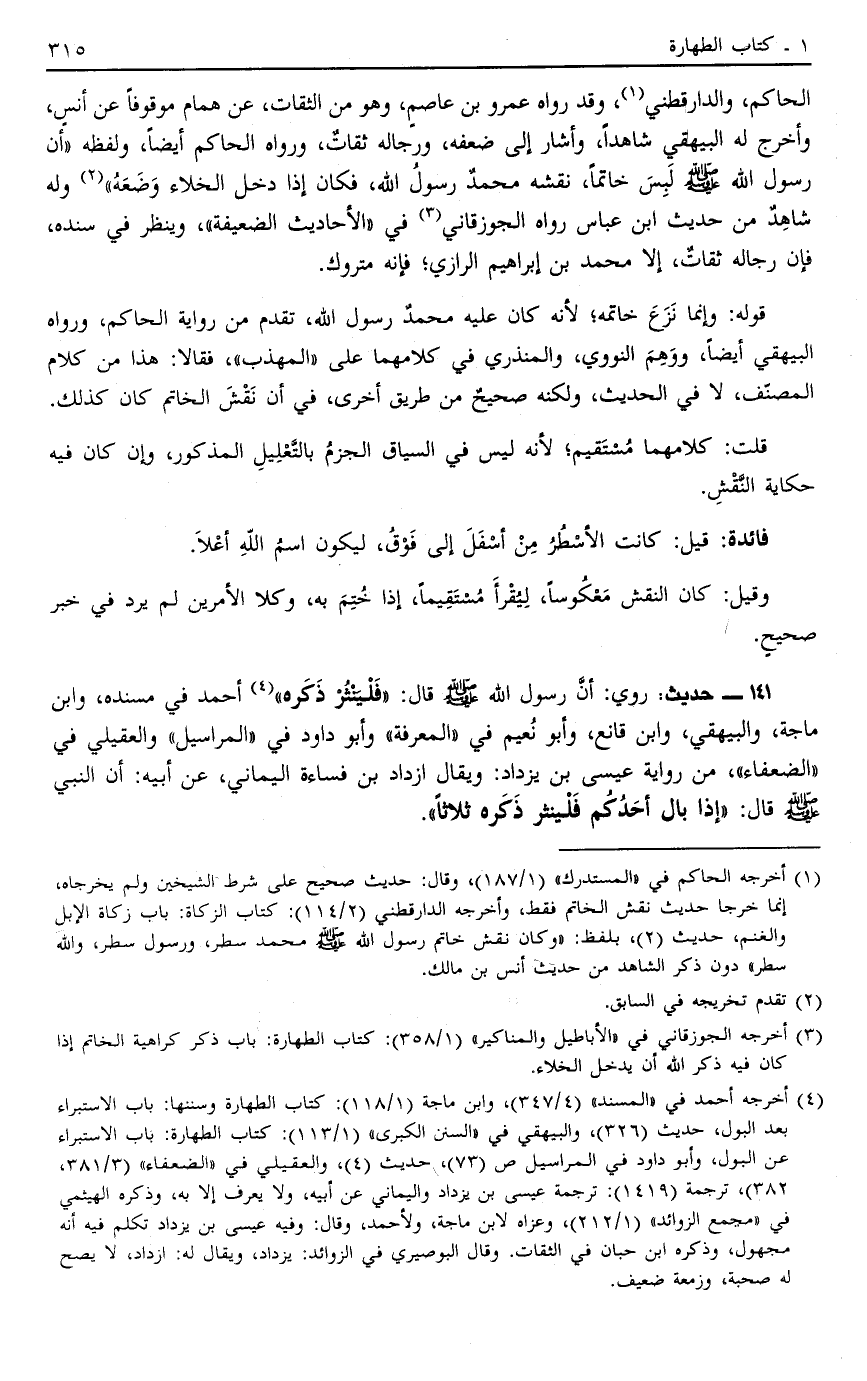 141 - حَدِيثٌ رُوِيَ أَنَّ رَسُولَ اللَّهِ صَلَّى اللَّهُ عَلَيْهِ وَسَلَّمَ قَالَ: "فَلْيَنْثُرْ ذَكَرَهُ" 4 أَحْمَدُ فِي مُسْنَدِهِ وَابْنُ مَاجَهْ وَالْبَيْهَقِيُّ وَابْنُ قَانِعٍ وَأَبُو نُعَيْمٍ فِي الْمَعْرِفَةِ وَأَبُو دَاوُد فِي الْمَرَاسِيلِ وَالْعُقَيْلِيُّ فِي الضُّعَفَاءِ مِنْ رِوَايَةِ عِيسَى بْنِ يَزْدَادَ وَيُقَالُ أَزْدَادُ بْنُ فَسَاءَةَ الْيَمَانِيُّ عَنْ أَبِيهِ أَنَّ النَّبِيَّ صَلَّى اللَّهُ عَلَيْهِ وَسَلَّمَ قَالَ: "إذَا بَالَ أَحَدُكُمْ فَلْيَنْثُرْ ذَكَرَهُ ثَلَاثًا".