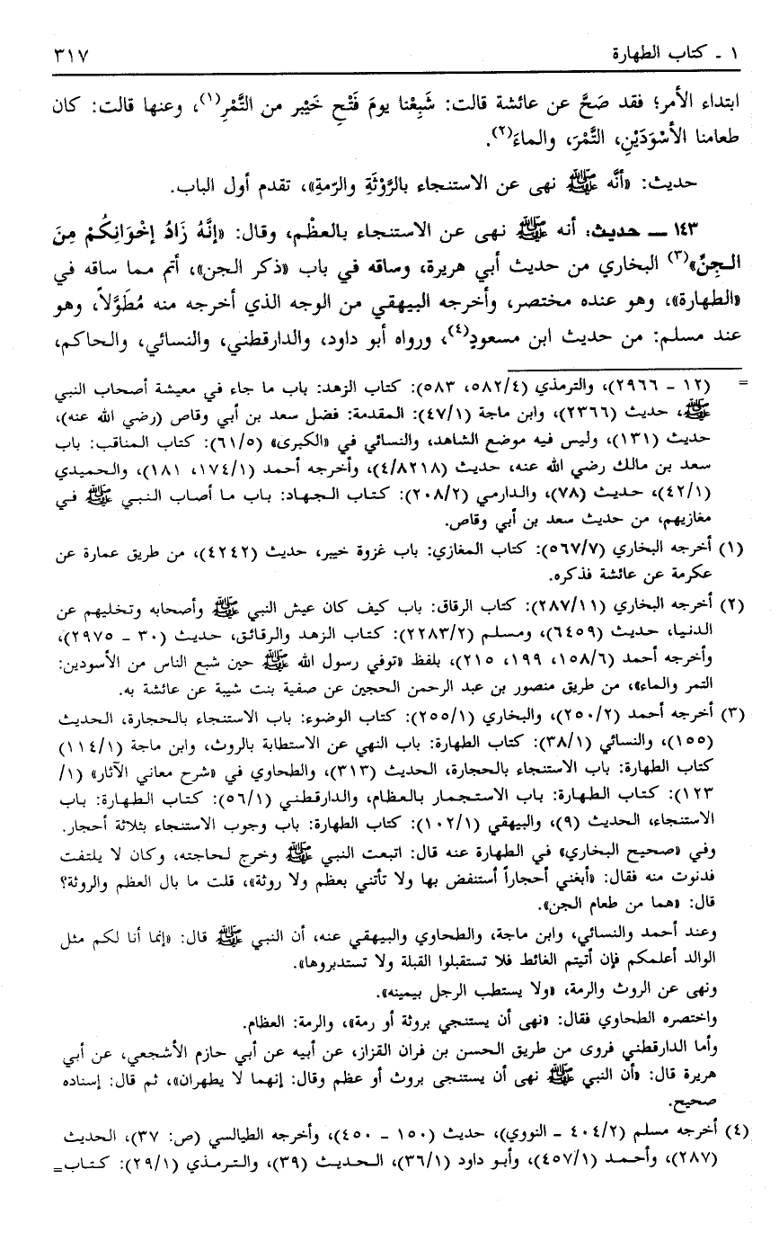 143 - حَدِيثُ: أَنَّهُ صَلَّى اللَّهُ عَلَيْهِ وَسَلَّمَ نَهَى عَنْ الِاسْتِنْجَاءِ بِالْعَظْمِ وَقَالَ: "إنَّهُ زَادُ إخْوَانِكُمْ مِنْ الْجِنِّ" 3 الْبُخَارِيُّ مِنْ حَدِيثِ أَبِي هُرَيْرَةَ وَسَاقَهُ فِي بَابِ ذِكْرِ الْجِنِّ أَتَمَّ مِمَّا سَاقَهُ فِي الطَّهَارَةِ وَهُوَ عِنْدَهُ مُخْتَصَرٌ وَأَخْرَجَهُ الْبَيْهَقِيُّ مِنْ الْوَجْهِ الَّذِي أَخْرَجَهُ مِنْهُ مُطَوَّلًا وَهُوَ عِنْدَ مُسْلِمٍ مِنْ حَدِيثِ ابْنِ مَسْعُودٍ4 وَرَوَاهُ أَبُو دَاوُد وَالدَّارَقُطْنِيّ وَالنَّسَائِيُّ وَالْحَاكِمُ،