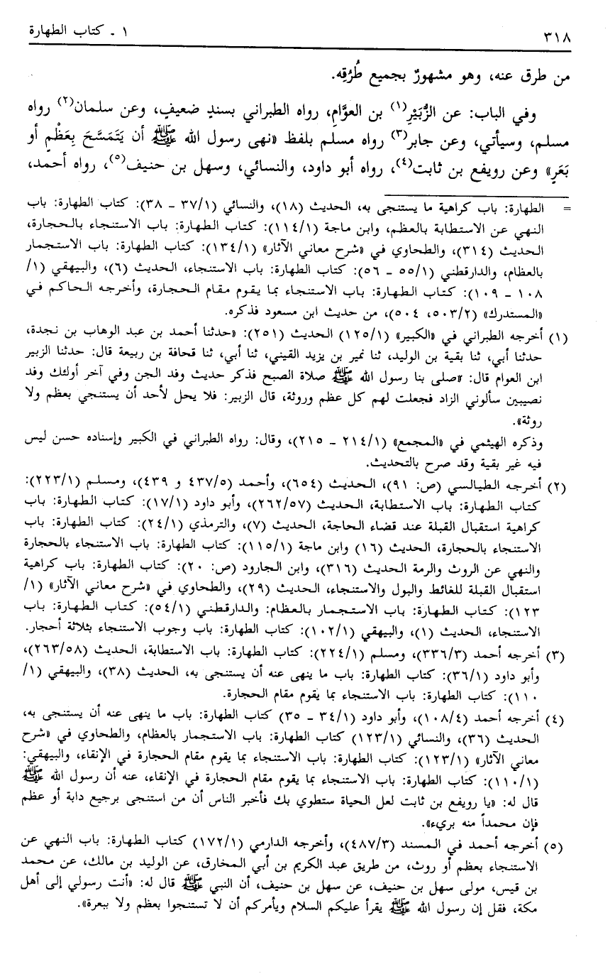 وَفِي الْبَابِ: عَنْ الزُّبَيْرِ1 بْنِ الْعَوَّامِ رَوَاهُ الطَّبَرَانِيُّ بِسَنَدٍ ضَعِيفٍ وَعَنْ سَلْمَانَ2 رَوَاهُ مُسْلِمٌ وَسَيَأْتِي وَعَنْ جَابِرٍ3 رَوَاهُ مُسْلِمٌ بِلَفْظِ: نَهَى رَسُولُ اللَّهِ صَلَّى اللَّهُ عَلَيْهِ وَسَلَّمَ أَنْ يَتَمَسَّحَ بِعَظْمٍ أَوْ بَعْرٍ وَعَنْ رُوَيْفِعِ بْنِ ثَابِتٍ4 رَوَاهُ أَبُو 1 دَاوُد وَالنَّسَائِيُّ وَسَهْلِ بْنِ حُنَيْفٍ5 رَوَاهُ أَحْمَدُ،