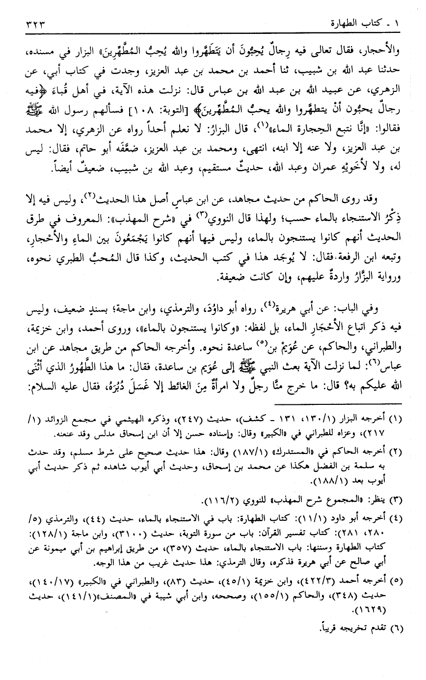 وَالْأَحْجَارِ فَقَالَ تَعَالَى: {فِيهِ رِجَالٌ يُحِبُّونَ أَنْ يَتَطَهَّرُوا وَاَللَّهُ يُحِبُّ الْمُطَّهِّرِينَ} [التوبة: 108] " الْبَزَّارُ 1 فِي مُسْنَدِهِ حَدَّثَنَا عَبْدُ اللَّهِ بْنُ شَبِيبٍ ثَنَا أَحْمَدُ بْنُ مُحَمَّدِ بْنِ عَبْدِ الْعَزِيزِ وَجَدْتُ فِي كِتَابِ أَبِي عَنْ الزُّهْرِيِّ عَنْ عُبَيْدِ اللَّهِ بن عبد الله ابْنِ عَبَّاسٍ قَالَ: نَزَلَتْ هَذِهِ الْآيَةُ فِي أَهْلِ قُبَاءَ {فِيهِ رِجَالٌ يُحِبُّونَ أَنْ يَتَطَهَّرُوا وَاَللَّهُ يُحِبُّ الْمُطَّهِّرِينَ} [التوبة: 108] فَسَأَلَهُمْ رَسُولُ اللَّهِ صَلَّى اللَّهُ عَلَيْهِ وَسَلَّمَ فَقَالُوا: إنَّا نُتْبِعُ الْحِجَارَةَ الْمَاءَ1 قَالَ الْبَزَّارُ: لَا نَعْلَمُ أَحَدًا رَوَاهُ عَنْ الزُّهْرِيِّ إلَّا مُحَمَّدُ بْنُ عَبْدِ الْعَزِيزِ وَلَا عَنْهُ إلَّا ابْنُهُ انْتَهَى وَمُحَمَّدُ بْنُ عَبْدِ الْعَزِيزِ ضَعَّفَهُ أَبُو حَاتِمٍ فَقَالَ: لَيْسَ لَهُ وَلَا لِأَخَوَيْهِ عِمْرَانَ وَعَبْدِ اللَّهِ حَدِيثٌ مُسْتَقِيمٌ وَعَبْدُ اللَّهِ بْنُ شَبِيبٍ ضَعِيفٌ أَيْضًا.