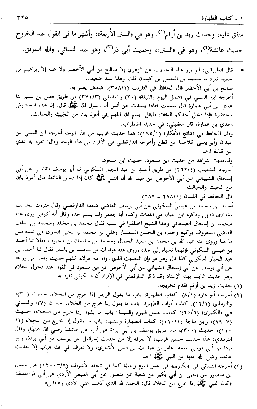 أخرجه ابن السني في "عمل اليوم والليلة" "20" والعقيلي "3/371" من طريق تطن بن نسير ثنا عدي بن أبي عمارة قال سمعت قتادة يحدث عن أنس أن رسول الله صَلَّى اللَّهُ عَلَيْهِ وَسَلَّمَ قال: "إن هذه الحشوش محتضرة فإذا دخل أحدكم الخلاء فليقل: بسم الله اللهم إني أعوذ بك من الخبث والخبائث".