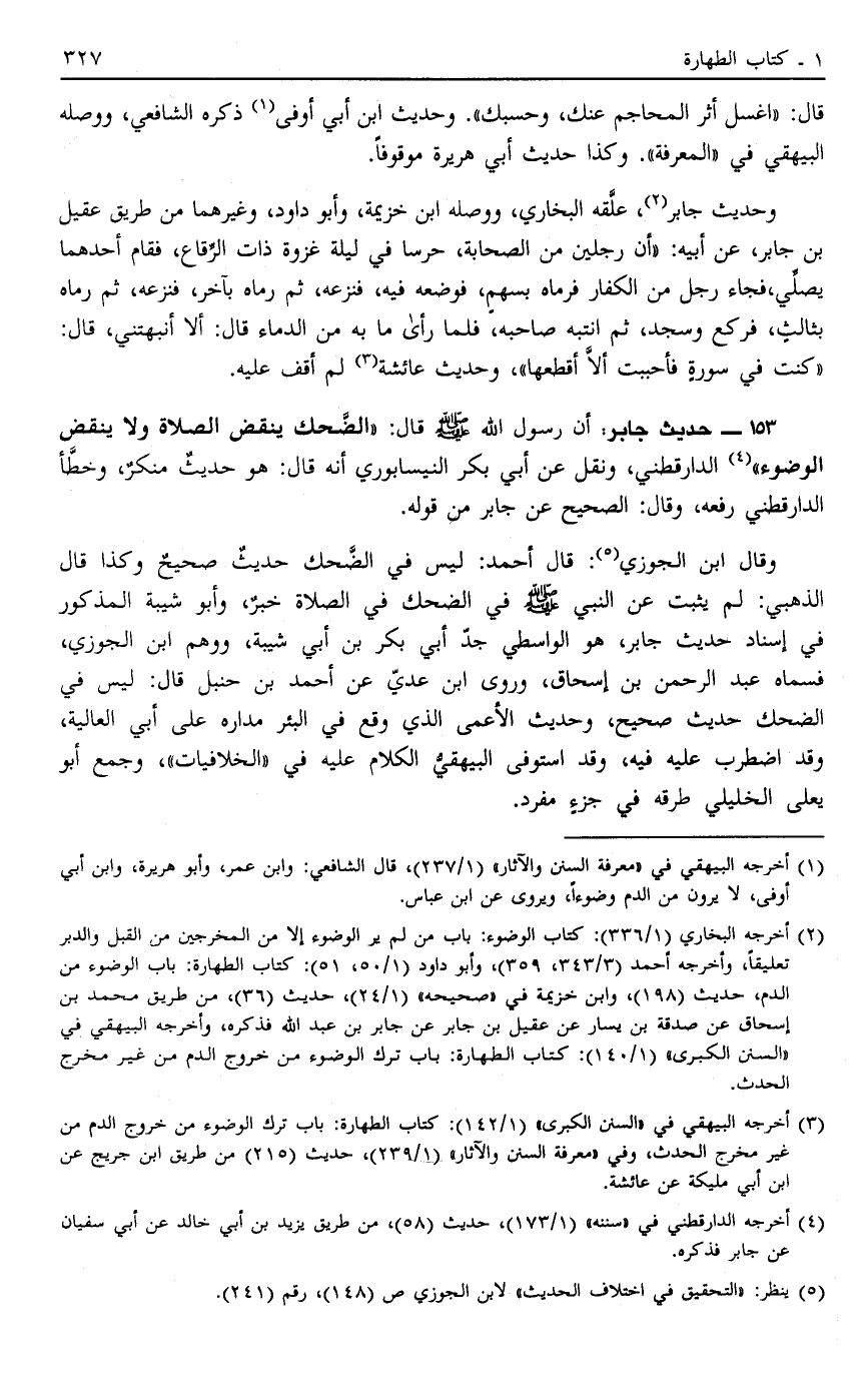 153 - حَدِيثُ جَابِرٍ أَنَّ رَسُولَ اللَّهِ صَلَّى اللَّهُ عَلَيْهِ وَسَلَّمَ قَالَ: "الضَّحِكُ يَنْقُضُ الصَّلَاةَ وَلَا يَنْقُضُ الْوُضُوءَ"4 الدَّارَقُطْنِيُّ وَنُقِلَ عَنْ أَبِي بَكْرٍ النَّيْسَابُورِيِّ أَنَّهُ قَالَ: هُوَ حَدِيثٌ منكر وخطأ الدارقطني رَفْعِهِ وَقَالَ: الصَّحِيحُ عَنْ جَابِرٍ مِنْ قَوْلِهِ.