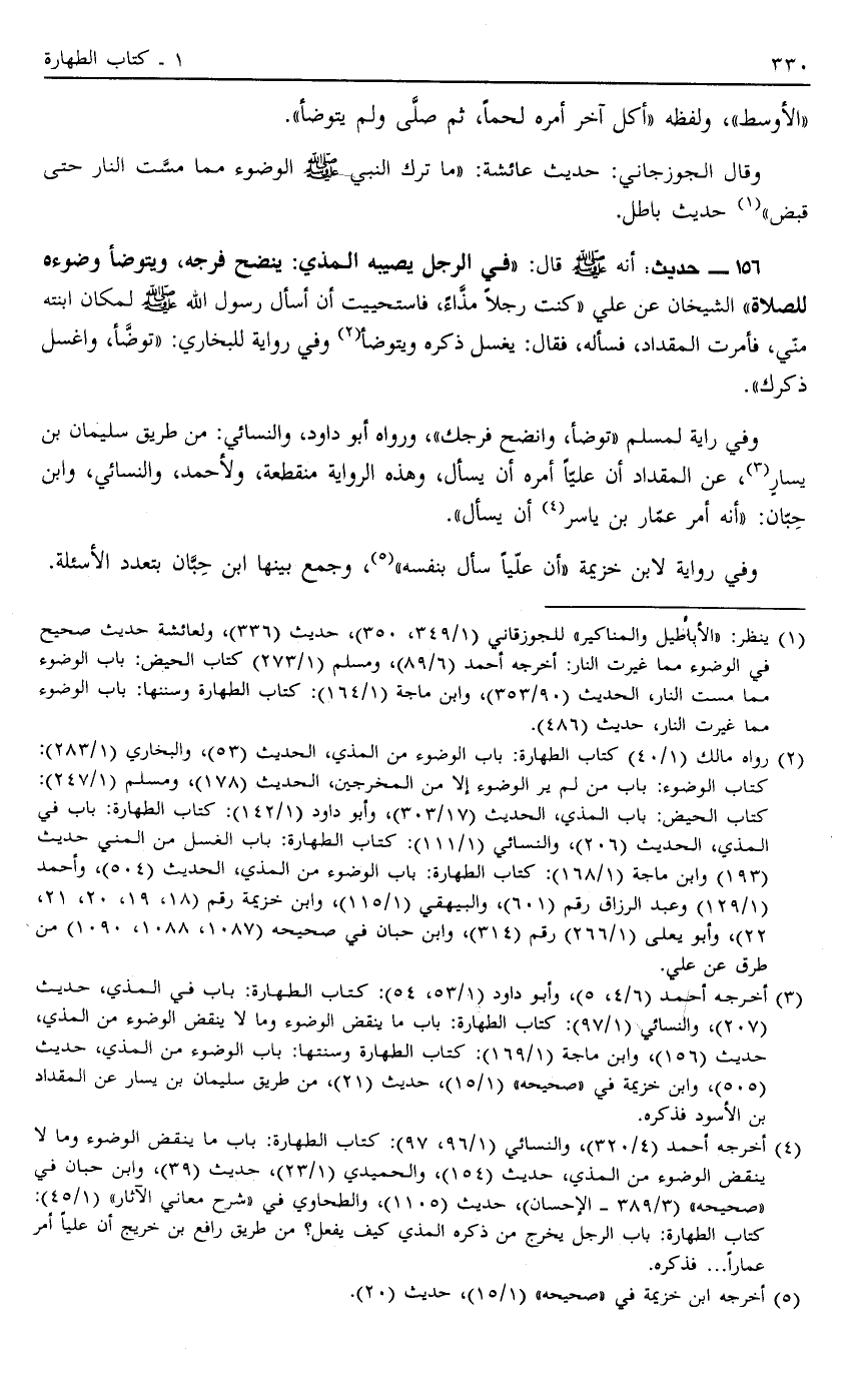 156 - حَدِيثُ أَنَّهُ صَلَّى اللَّهُ عَلَيْهِ وَسَلَّمَ قَالَ فِي الرَّجُلِ يُصِيبُهُ الْمَذْيُ: "يَنْضَحُ فَرْجَهُ وَيَتَوَضَّأُ وُضُوءَهُ لِلصَّلَاةِ" الشَّيْخَانِ عَنْ عَلِيٍّ كُنْتُ رَجُلًا مَذَّاءً فَاسْتَحْيَيْتُ أَنْ أَسْأَلَ رَسُولَ اللَّهِ صَلَّى اللَّهُ عَلَيْهِ وَسَلَّمَ لِمَكَانِ ابْنَتِهِ مِنِّي فَأَمَرْتُ الْمِقْدَادَ فَسَأَلَهُ فَقَالَ: "يَغْسِلُ ذَكَرَهُ وَيَتَوَضَّأُ" 2 وَفِي رِوَايَةٍ لِلْبُخَارِيِّ "تَوَضَّأْ وَاغْسِلْ ذَكَرَكَ".