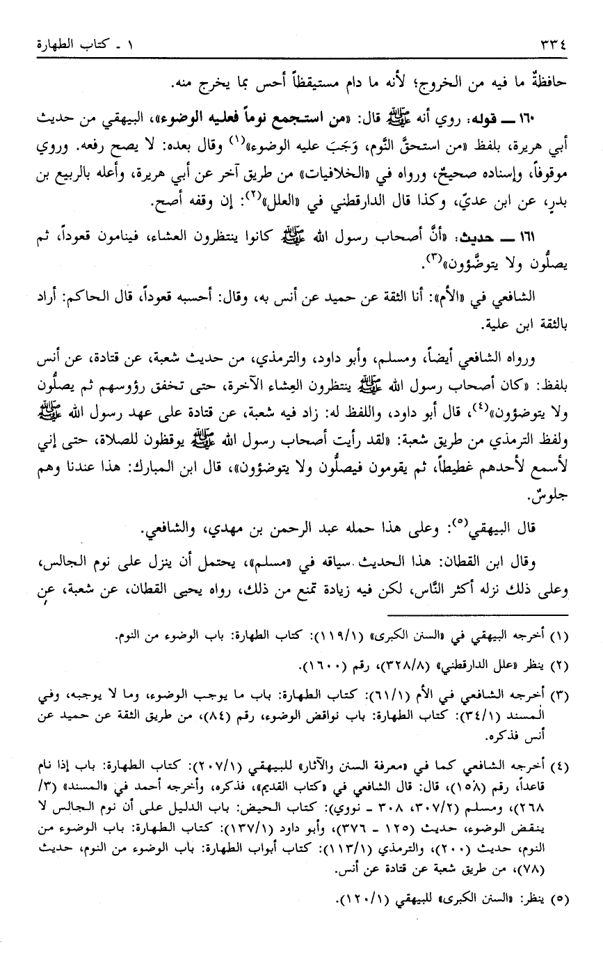 160 - قَوْلُهُ: رُوِيَ أَنَّهُ صَلَّى اللَّهُ عَلَيْهِ وَسَلَّمَ قَالَ: "مَنْ اسْتَجْمَعَ نَوْمًا فَعَلَيْهِ الْوُضُوءُ" الْبَيْهَقِيُّ مِنْ حَدِيثِ أَبِي هُرَيْرَةَ بِلَفْظِ: "مَنْ اسْتَحَقَّ النَّوْمَ وَجَبَ عَلَيْهِ الْوُضُوءُ" 1 وَقَالَ بَعْدَهُ لَا يَصِحُّ رَفْعُهُ وَرُوِيَ مَوْقُوفًا وَإِسْنَادُهُ صَحِيحٌ وَرَوَاهُ فِي الْخِلَافِيَّاتِ مِنْ طَرِيقٍ آخَرَ عَنْ أَبِي هُرَيْرَةَ وَأَعَلَّهُ بِالرَّبِيعِ بْنِ بَدْرٍ عَنْ ابْنِ عَدِيٍّ وَكَذَا قَالَ الدَّارَقُطْنِيُّ فِي الْعِلَلِ2 إنَّ وَقْفَهُ أَصَحُّ.