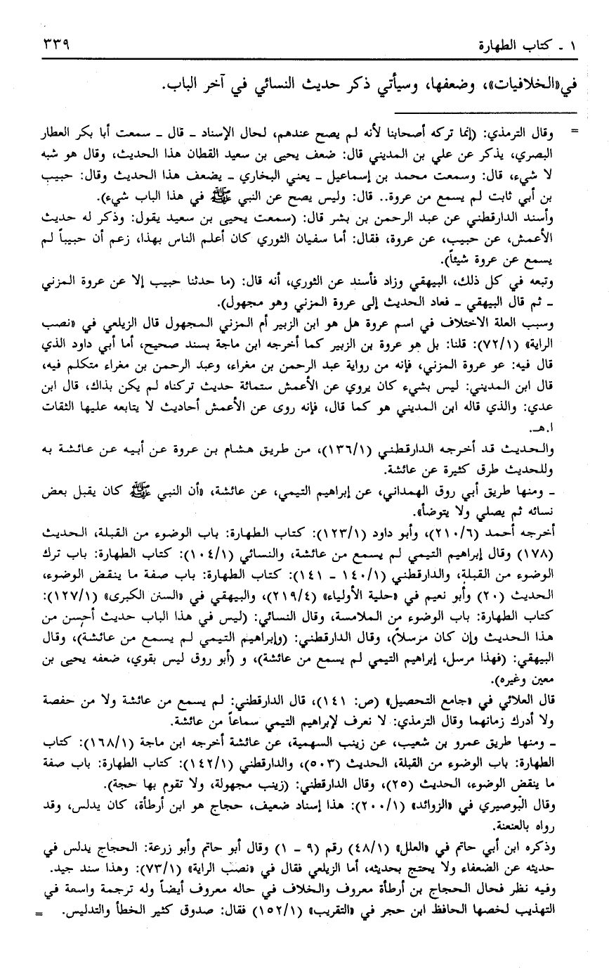 - ومنها طريق أبي روق الهمداني، عن إبراهيم التيمي، عن عائشة، " أن النبي صَلَّى اللَّهُ عَلَيْهِ وَسَلَّمَ كان يقبل بعض نسائه ثم يصلي ولا يتوضأ.
