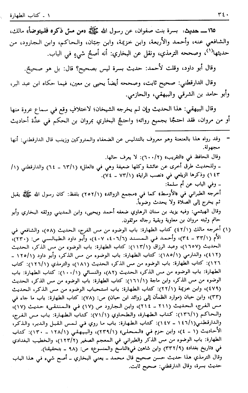 165 - حَدِيثُ: بُسْرَةَ بِنْتِ صَفْوَانَ عَنْ رَسُولِ اللَّهِ صَلَّى اللَّهُ عَلَيْهِ وَسَلَّمَ: "مَنْ مَسَّ ذَكَرَهُ فَلْيَتَوَضَّأْ" مَالِكٌ وَالشَّافِعِيُّ عَنْهُ وَأَحْمَدُ وَالْأَرْبَعَةُ وَابْنُ خُزَيْمَةَ وَابْنُ حِبَّانَ وَالْحَاكِمُ وَابْنُ الْجَارُودِ مِنْ حَدِيثِهَا1 وَصَحَّحَهُ التِّرْمِذِيُّ وَنُقِلَ عَنْ الْبُخَارِيِّ أَنَّهُ أَصَحُّ شَيْءٍ فِي الْبَابِ.