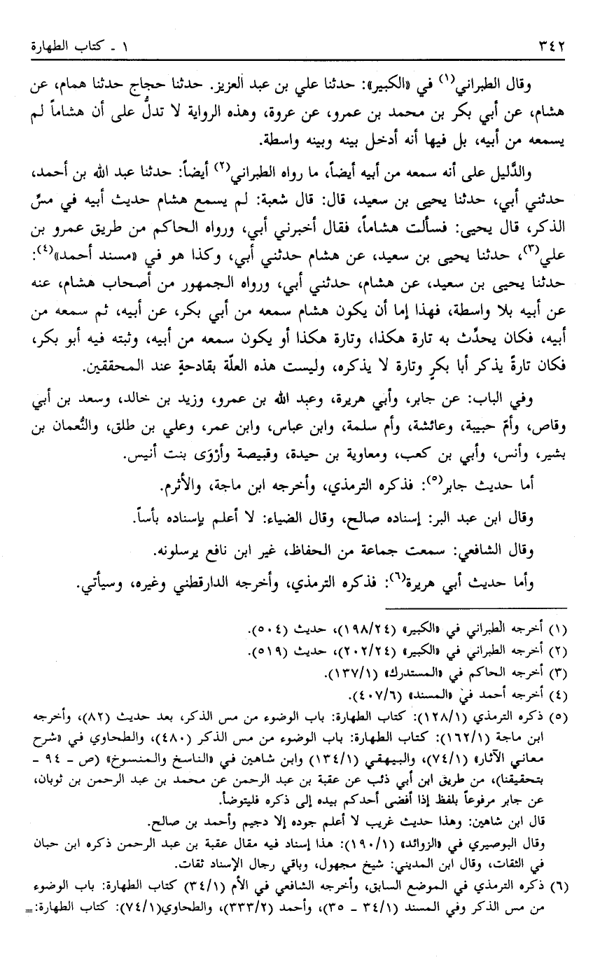 وَالدَّلِيلُ عَلَى أَنَّهُ سَمِعَهُ مِنْ أَبِيهِ أَيْضًا مَا رَوَاهُ الطَّبَرَانِيُّ2 أَيْضًا حَدَّثَنَا عَبْدُ اللَّهِ بْنُ أَحْمَدَ حَدَّثَنِي أَبِي حَدَّثَنَا يَحْيَى بْنُ سَعِيدٍ قَالَ قَالَ شُعْبَةُ لَمْ يَسْمَعْ هِشَامٌ حَدِيثَ أَبِيهِ فِي مَسِّ الذَّكَرِ قَالَ يَحْيَى فَسَأَلْت هِشَامًا فَقَالَ أَخْبَرَنِي أَبِي وَرَوَاهُ الْحَاكِمُ مِنْ طَرِيقِ عَمْرِو بْنِ عَلِيٍّ3 حَدَّثَنَا يَحْيَى بْنُ سَعِيدٍ عَنْ هِشَامٍ حَدَّثَنِي أَبِي وَكَذَا هُوَ فِي مُسْنَدِ أَحْمَدَ4 حَدَّثَنَا يَحْيَى بْنُ سَعِيدٍ عَنْ هِشَامٍ حَدَّثَنِي أَبِي وَرَوَاهُ الْجُمْهُورُ مِنْ أَصْحَابِ هِشَامٍ عَنْهُ عَنْ أبيه بلا واسطة فَهَذَا إمَّا أَنْ يَكُونَ هِشَامٌ سَمِعَهُ مِنْ أَبِي بَكْرٍ عَنْ أَبِيهِ ثُمَّ سَمِعَهُ مِنْ أَبِيهِ فَكَانَ يُحَدِّثُ بِهِ تَارَةً هَكَذَا وَتَارَةً هَكَذَا أَوْ يَكُونُ سَمِعَهُ مِنْ أَبِيهِ وَثَبَتَهُ فِيهِ أَبُو بَكْرٍ فَكَانَ تَارَةً يَذْكُرُ أَبَا بَكْرٍ وَتَارَةً لَا يَذْكُرُهُ وَلَيْسَتْ هَذِهِ الْعِلَّةُ بِقَادِحَةٍ عِنْدَ الْمُحَقِّقِينَ.