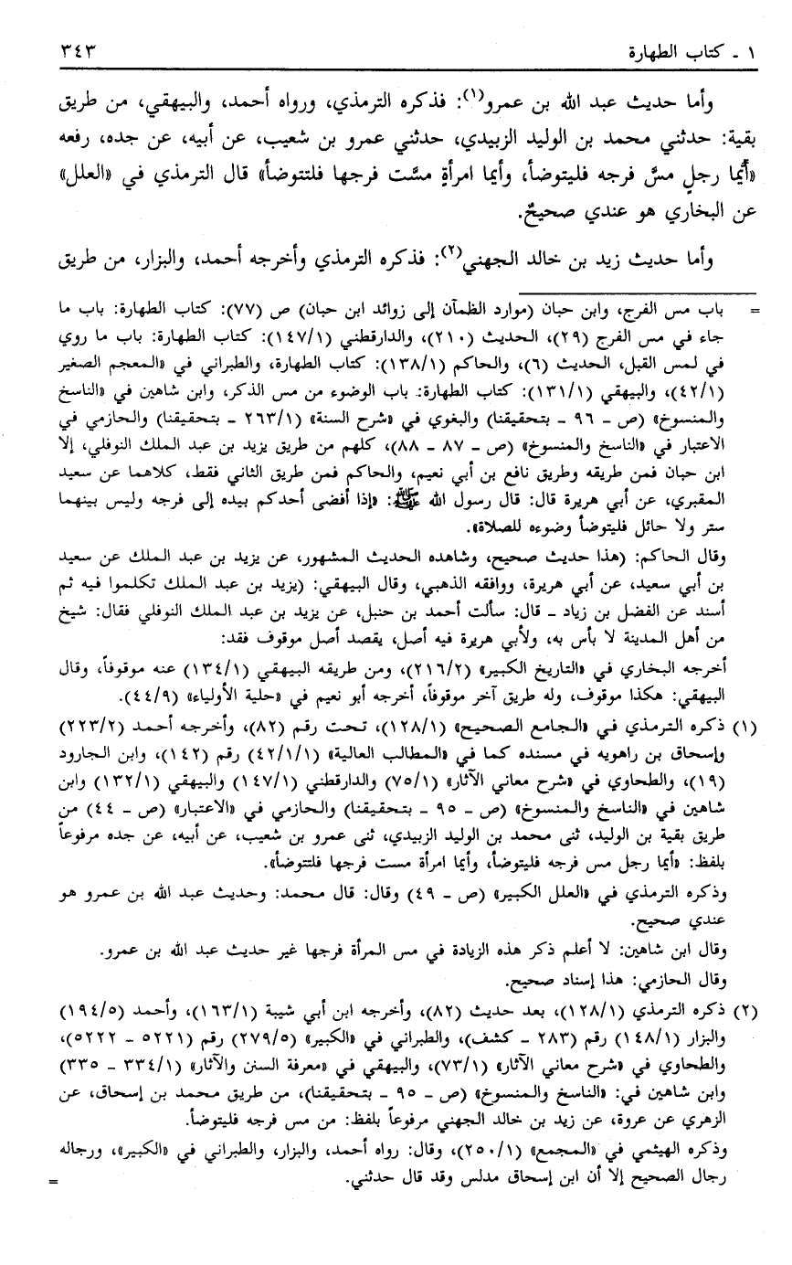 وَأَمَّا حَدِيثُ عَبْدِ اللَّهِ بْنِ عَمْرٍو1: فَذَكَرَهُ التِّرْمِذِيُّ وَرَوَاهُ أَحْمَدُ وَالْبَيْهَقِيُّ مِنْ طَرِيقِ بَقِيَّةَ حَدَّثَنِي مُحَمَّدُ بْنُ الْوَلِيدِ الزُّبَيْدِيُّ حَدَّثَنِي عَمْرُو بْنُ شُعَيْبٍ عَنْ أَبِيهِ عَنْ جَدِّهِ رَفَعَهُ "أَيُّمَا رَجُلٍ مَسَّ فَرْجَهُ فَلْيَتَوَضَّأْ وَأَيُّمَا امْرَأَةٍ مَسَّتْ فَرْجَهَا فَلْتَتَوَضَّأْ" قَالَ التِّرْمِذِيُّ فِي الْعِلَلِ عَنْ الْبُخَارِيِّ هُوَ عِنْدِي صَحِيحٌ.